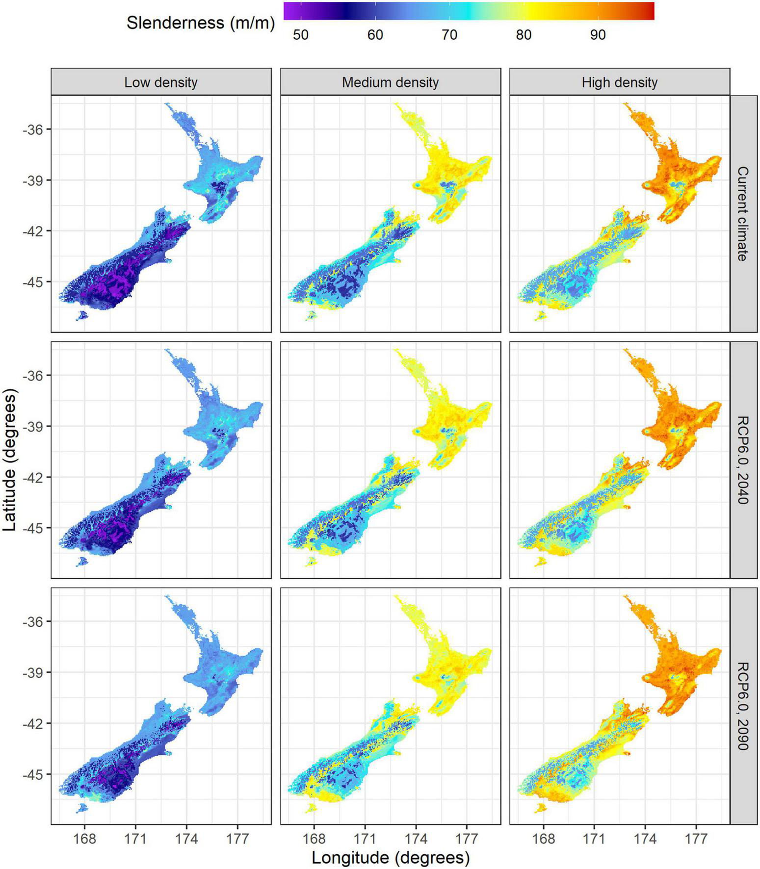 The final model of slenderness was used to generate predictions of slenderness across New Zealand under current climate for the three silvicultural regimes. Projections were also made under future climate using the factorial combination of the four RCPs, two time periods (2040, 2090) and three silvicultural regimes (i.e., 24 projections). All these projections were made using a constant value raster of 30 years for stand age as this is the typical harvest age for radiata pine in New Zealand and also a period of high vulnerability to wind damage. Constant value rasters for stand densities of 200, 500, and 700 stems ha–1 were used for model projections as these represent, respectively, the density at age 30 years for the selected low, medium and high density regimes (Table 2). An additional 24 surfaces were created describing the percentage difference in slenderness between the eight climate change projections and current climate for all three silvicultural regimes.