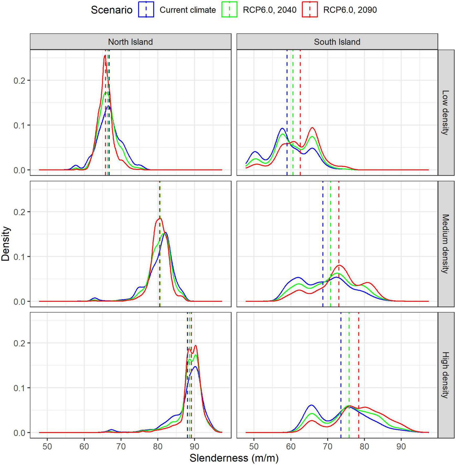Under current climate the model predictions showed significant differences in slenderness among silvicultural regimes. Average slenderness values across New Zealand were 62.1 m m–1 for low density regimes, 73.5 m m–1 for medium density regimes and 79.5 m m–1 under high density regimes (Table 3). Values were markedly higher for all three regimes within the North than the South Island (Figure 5) and these regional differences diverged as stand density increased from low density regimes (66.8 vs. 59.0 m m–1) to high density carbon regimes (88.1 vs. 73.6 m m–1). Similarly, the percentage of areas, likely to be at risk of wind, with slenderness values >80 m m–1, was markedly higher within the North than the South Island, for medium (65 vs. 5%) and high density regimes (95 vs. 19%), but no areas with slenderness >80 m m–1 were noted for the low density regime (Figure 5). Within all three regimes the areas with the highest values were in warm areas with moderately high rainfall, such as the central North Island (Figure 5). In contrast, the lowest values of predicted slenderness were located at cold, dry eastern regions in the South Island (Figure 5).
