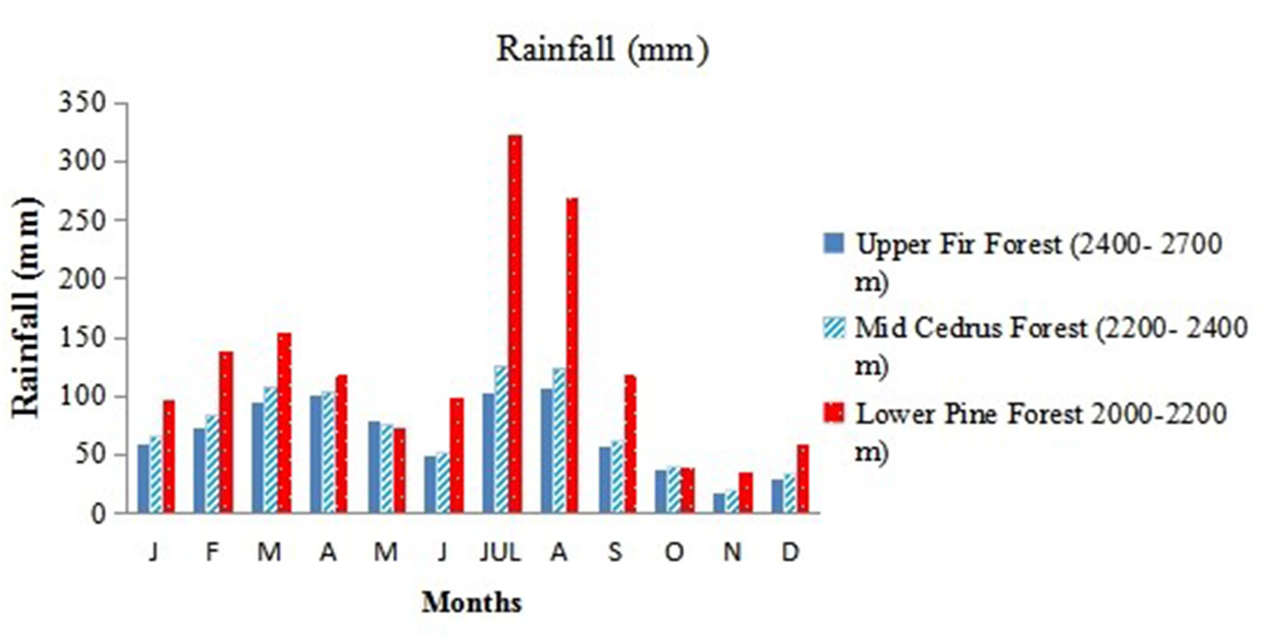 Mean monthly rainfall distribution of three forest types: low-level blue pine forests (lower pine forests), mid-Cedrus deodara forests (mid-Cedrus forests), and upper Abies pindrow forest (upper fir forests) along an altitudinal gradient.
