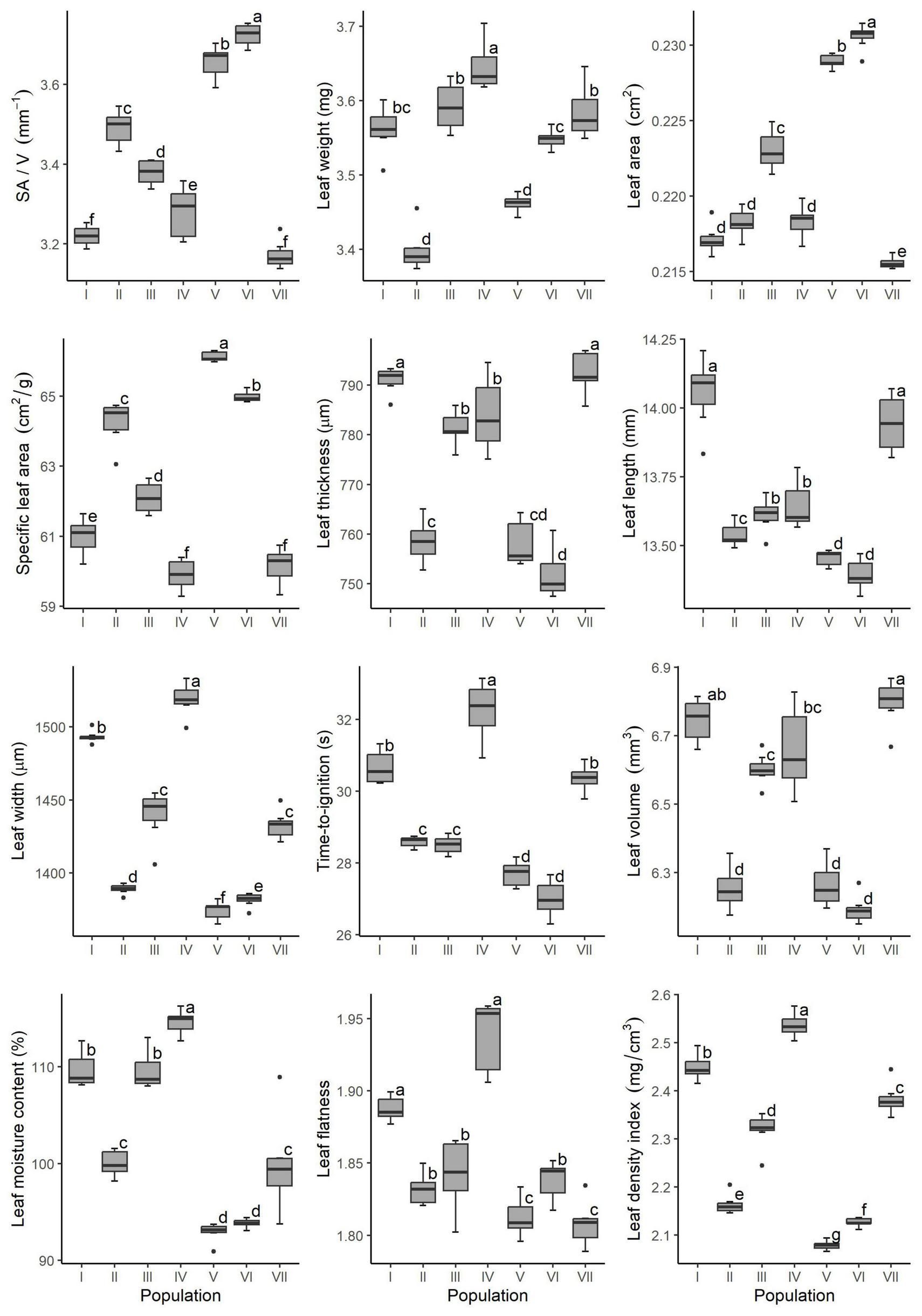 The seven populations differed in terms of fresh-leaves time-to-ignition (Figure 1). Population IV had the longest TTI, followed by populations I and VII, after which populations II and III, and finally populations V and VI had the shortest TTI. Inter-population differences in morpho-ecophysiological parameters were also significant, but not consistent among populations (Figure 1). The most distinct inter-population differences were found for leaf density index (where all seven populations significantly differed from each other), SLA, SA/V and leaf width (where only two of seven populations did not show a significant difference), and scanned area (with three populations sharing similar values). The smaller inter-population differences were found for MC, leaf thickness, length, weight and volume (four significantly different values were found among seven populations), and leaf flatness (three significantly distinct values were found among seven populations).