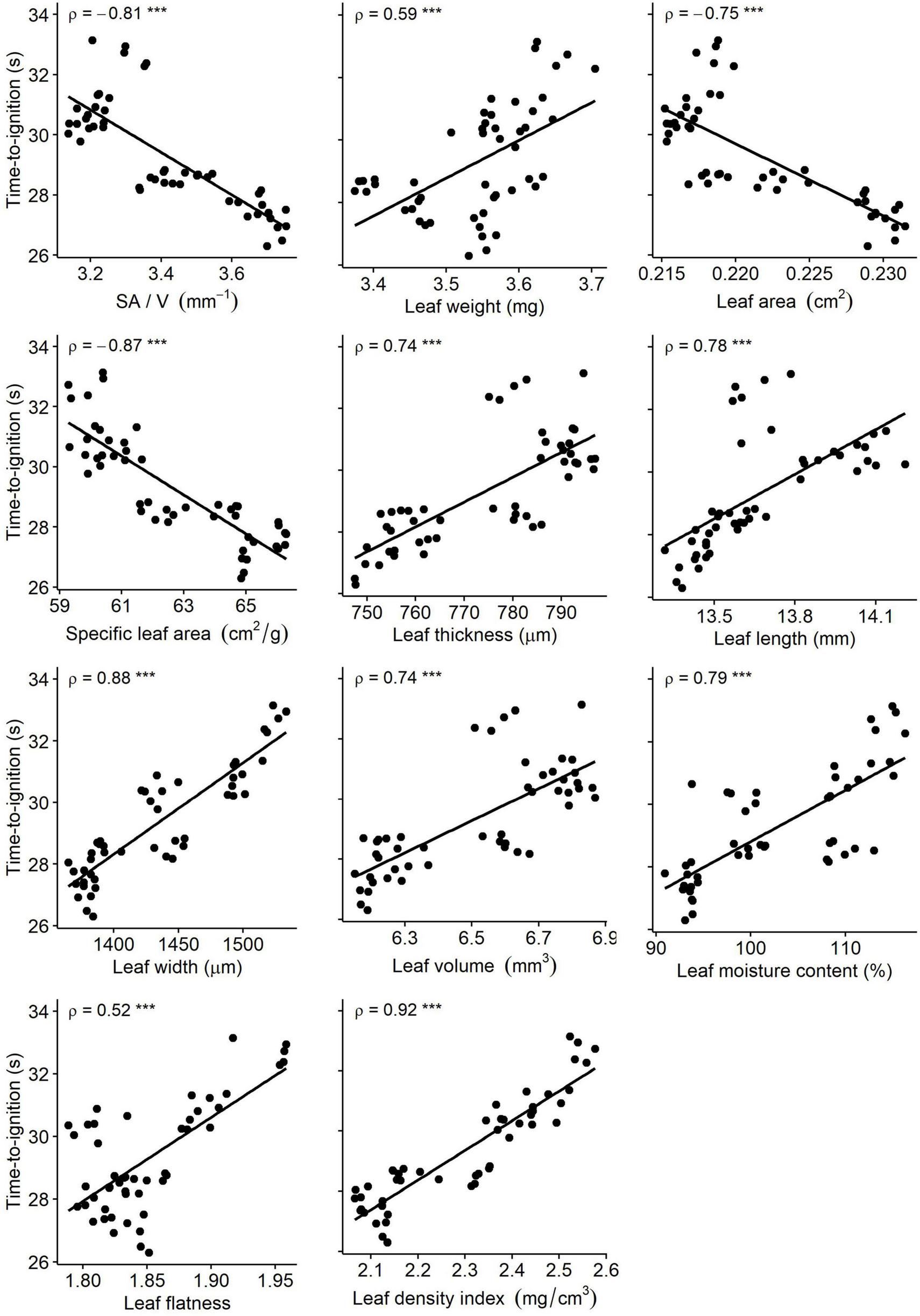 Time-to-ignition (TTI) was negatively influenced by leaf area-related measures SA/V (ρ = −0.81, p < 0.0001), scanned area (ρ = −0.75, p < 0.0001), and SLA (ρ = −0.87, p < 0.0001), with larger leaves having a shorter time-to-ignition (Figure 2). TTI was positively influenced by the following measures, in order of strength of correlation: density index (ρ = +0.92, p < 0.0001), leaf width (ρ = +0.88, p < 0.0001), MC (ρ = +0.79, p < 0.0001), leaf length (ρ = +0.78, p < 0.0001), thickness (ρ = +0.74, p < 0.0001), volume (ρ = +0.74, p < 0.0001), weight (ρ = +0.59, p < 0.0001), flatness (ρ = +0.52, p < 0.001).