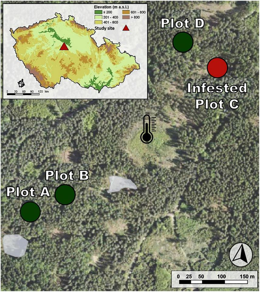 Arrangement of study plots with the naturally attacked plot. Green circles represent the inner forest plots (non-attacked trees), corresponding to plots A, B, and D. Plot C was infested by I. typographus on June 16th and salvaged in July (red circle). The gray spots are areas of previous natural bark beetle attack. The black thermometer marks the meteorological station.