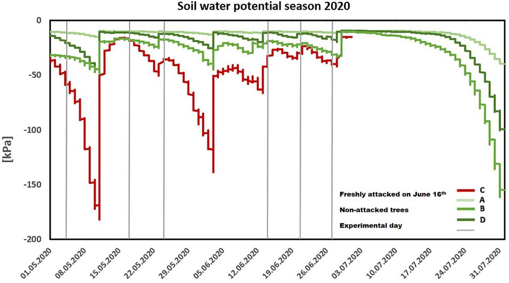 Seasonal trend of soil water potential (2020). Individual lines represent measurements through the season in freshly attacked plot C (red color)/the non-attacked plots A, B, and D (green color). The gray color (vertical line) represents individual experiments.
