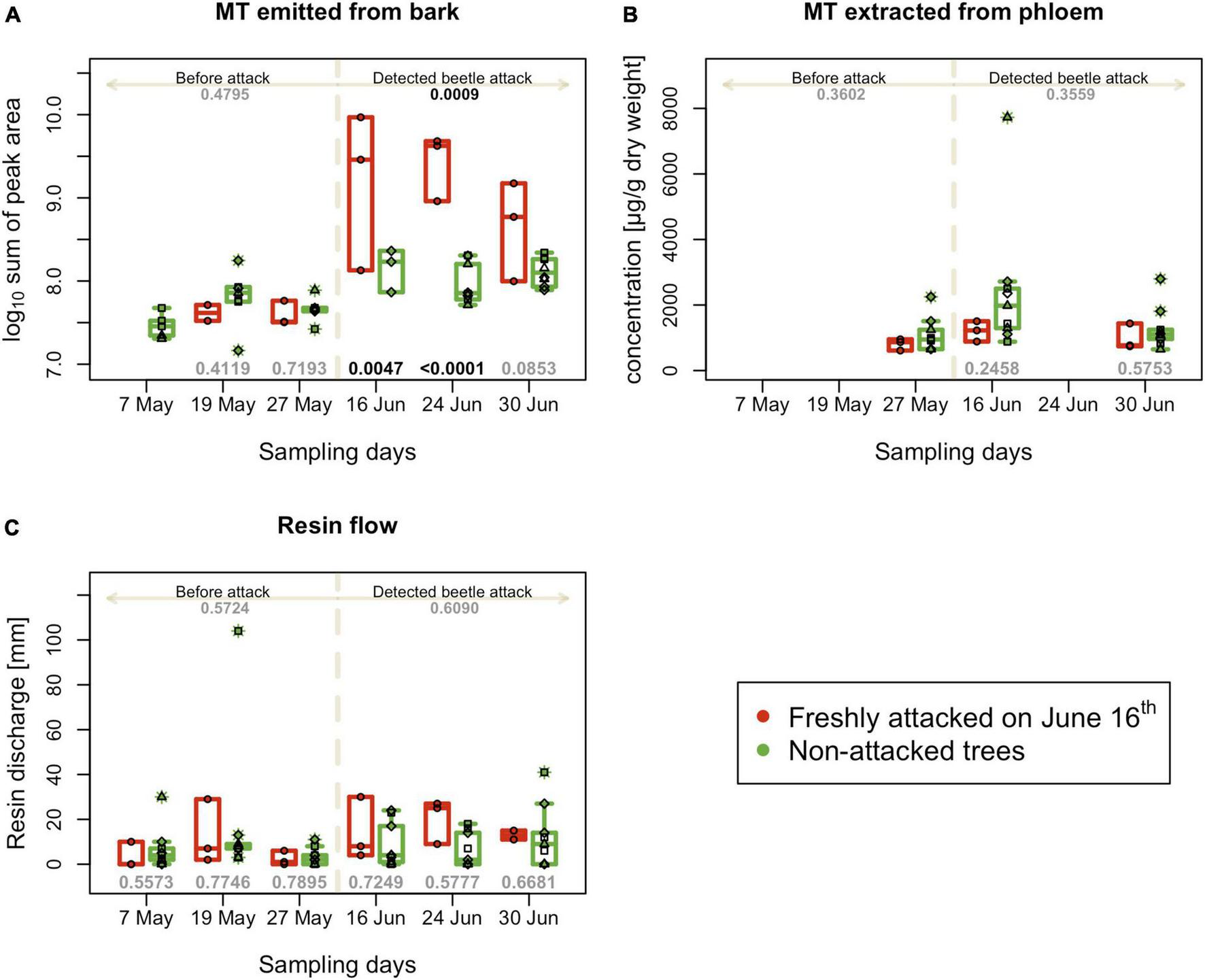 Tree defense characteristics recorded on individual trees on different experimental days. (A) Sum of peak areas of selected monoterpenes emitted by bark (B) Sum of peak selected monoterpenes extracted from phloem - performed three times per season; (C) resin flow per 24 h; boxplots summarize measurements on respective experimental days at the freshly attacked subplot C (red color) and control subplots A, B, and D (green color). Individual measurements are represented by circles (subplot C) and squares, triangles and diamonds for subplot A, B and C. Numbers on the top are p-values for differences between attacked and non-attacked plots calculated by post hoc Tukey analyses based on repeated measures GLMM separately for pre-attack and attack period; bottom numbers are p-values for differences between attacked and non-attacked plots estimated by post hoc Tukey analyses in the given sampling time. The dashed line represents the period when the bark beetle attack was detected (from June 16th).