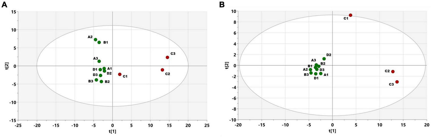 (A) PCA scores plot, showing the distribution of samples, according to the whole collected profile of volatiles, measured using GC-EI-TOF-MS. Individual points represent measurements of trees on June 24th in freshly attacked plot C (red color) with three trees/Non-attacked plots A- three trees, B-three trees, D-three trees (green color). Hoteling ellipse with significance level 0.05, t1 and t2 stand for the two most important components, together explaining 51% of the variance in data (B) PLS-DA scores plot showing the distribution of samples in the discriminant analysis model, using attacked vs. non-attacked as classes.