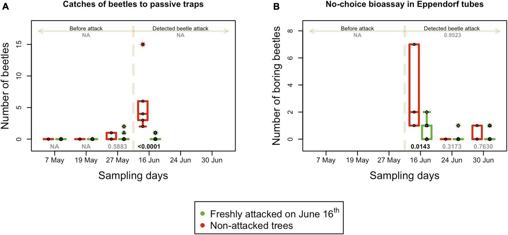 Absolute numbers of active I. typographus in the field. (A) Number of beetles caught in passive traps in the long-distance attraction bioassay. (B) Number of beetles that attacked trees in Eppendorf tubes in the no-choice bioassay; boxplots summarize measurements on respective experimental days at the freshly attacked subplot C (red color) and control subplots A, B, and D (green color). Individual measurements are represented by circles (subplot C) and squares, triangles and diamonds for subplot A, B, and C. Numbers on the top are p-values of differences between attacked and non-attacked plots calculated by post hoc Tukey analyses based on repeated measures GLMM separately for pre-attack and attack period; bottom numbers are p-values of differences between attacked and non-attacked plots estimated by post hoc Tukey analyses in the given sampling time. The dashed line represents the period when the bark beetle attack was detected (from June 16th).