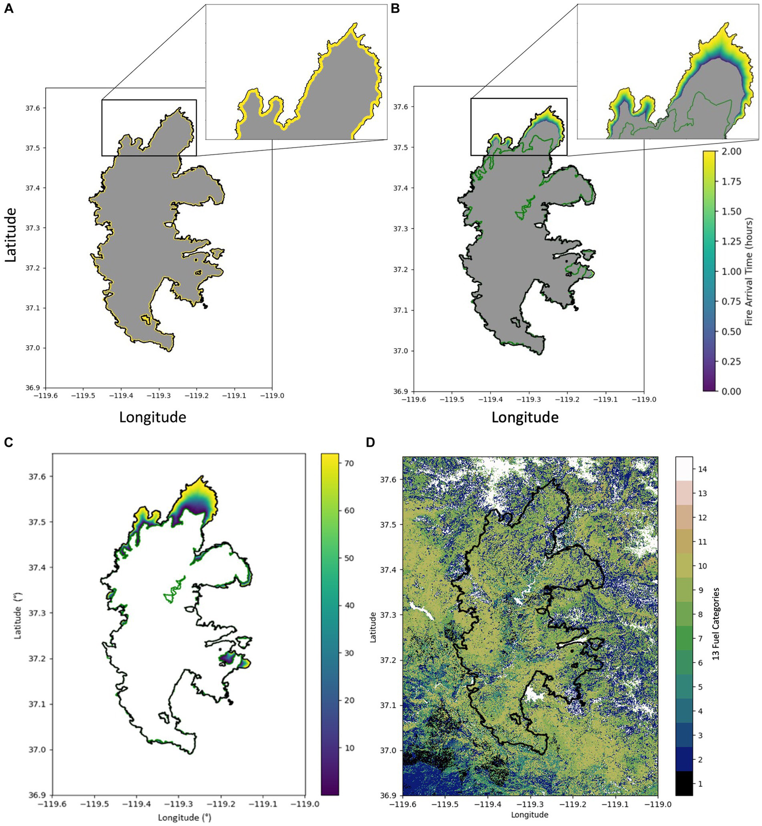 For each day in the study period, two fire-atmosphere forecast initialization methods were tested. The first simulation used the simple method with instantaneous ignition (Figure 2B), while the second simulation used the spin-up method with gradual fire ignition illustrated in Figure 2C. The initialization with the simple method was performed based on the most recent fire perimeter taken from the National Infrared Operations (NIROPS) data, which were available prior to the forecast start time (see Figure 5A). The most recent perimeter (black line) is used to ignite the fire (see yellow line in Figure 5A), while unburnable fuel (gray fill) is set inside of it.