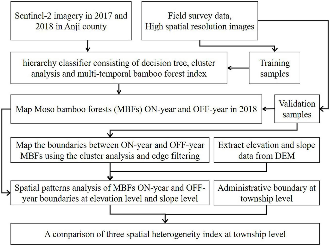 (1) Data collection (e.g., field survey data, administrative units, terrain data, and Sentinel-2 data) and preprocessing (geometric corrections among different data sources); (2) on-year and off-year MBF mapping using Sentinel-2 images and a hierarchy classifier; (3) development of boundaries between on-year and off-year MBFs and accuracy assessment; (4) spatial pattern analysis of MBF on-year and off-year boundaries at the elevation and slope levels; and (5) a comparison of three spatial heterogeneity indices at the township level.