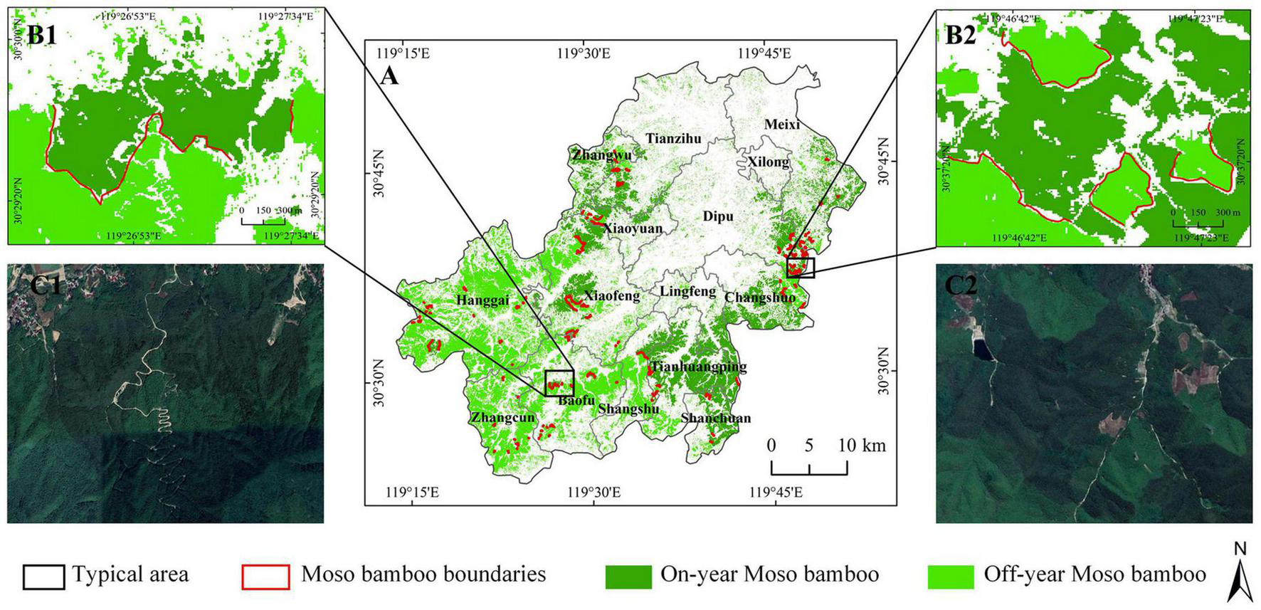 Moso bamboo forest on/off-year and boundary line maps for 2018 based on Sentinel-2 data, (A) MBFs maps in Anji County, (B1) and (B2) typical on/off-year maps and boundary lines (solid red line), (C1) and (C2) Sentinel-2 data and boundary lines.