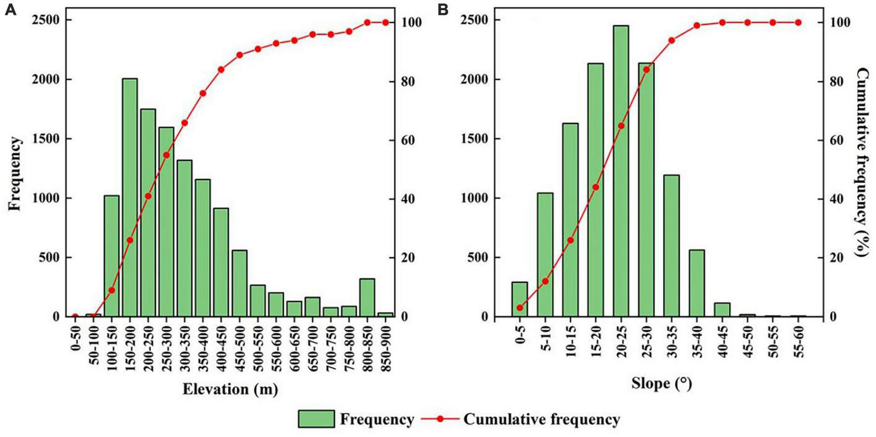 The boundary lines of the 140 MBFs showed different statistical characteristics in terms of elevation and slope. As shown in Figure 6A, the boundary lines were distributed between elevations of 79 and 856 m. Within the elevation range of 100–200 m, the number of boundary lines showed an overall increasing trend. The distribution was most concentrated near an elevation of 200 m and showed a decreasing trend above 200 m. The cumulative percentage of the boundary line distribution frequency within 500 m increased rapidly, that between 500 and 900 m slowly increased. Ninety-five percent of the MBFs were distributed in the range of 100 to 600 m.