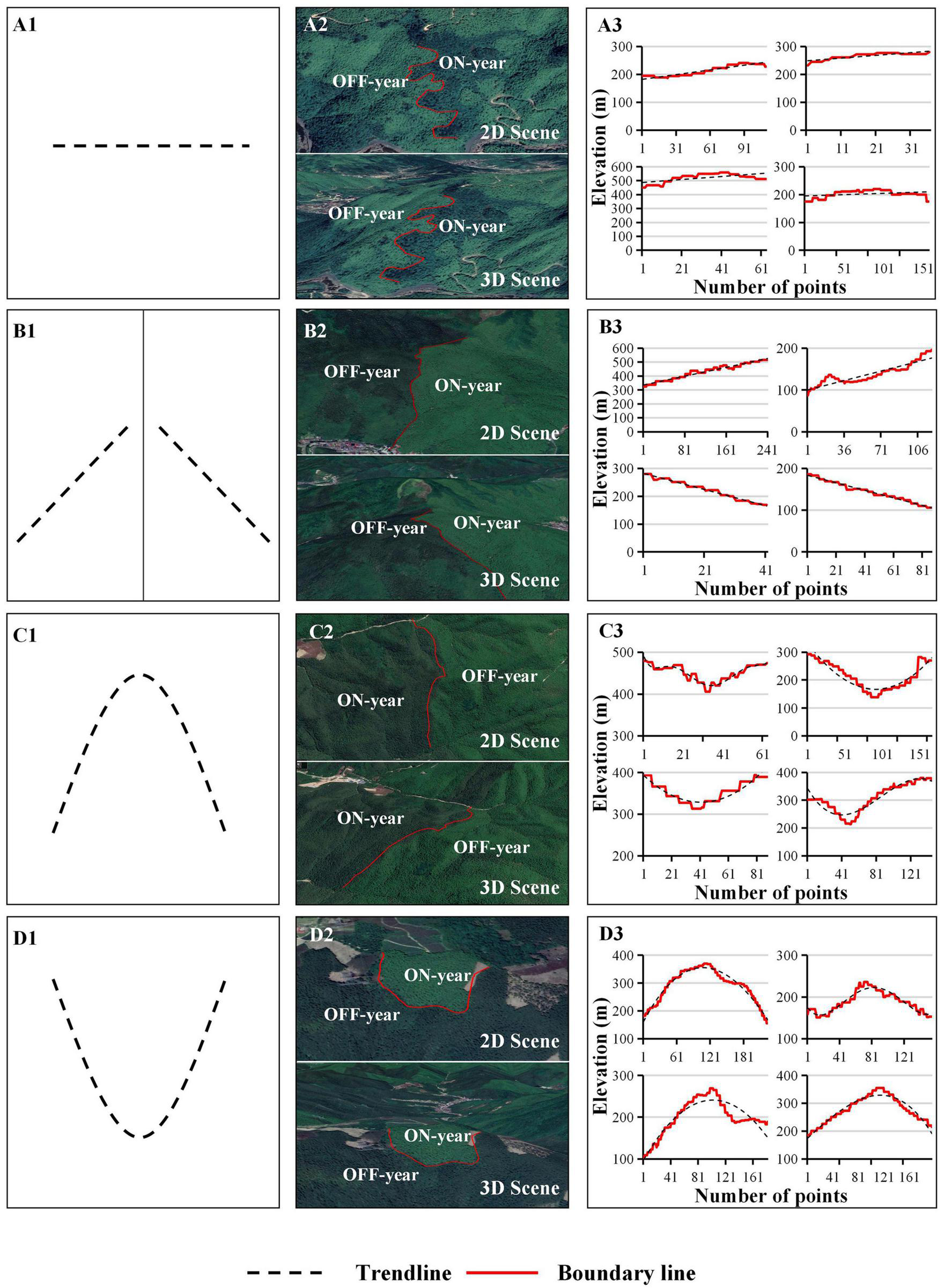 Horizontal view of the on-/off-year boundary variation in elevation. (A1–A3) Series represent stable type, (B1–B3) series represent single-change (ascending or descending) type, (C1–C3) series represent ascending then descending type, (D1–D3) series represent descending then ascending type. Series1 represent spatial type, series2 represent 2D/3D Scene, series3 represent diagram of typical boundary changes.