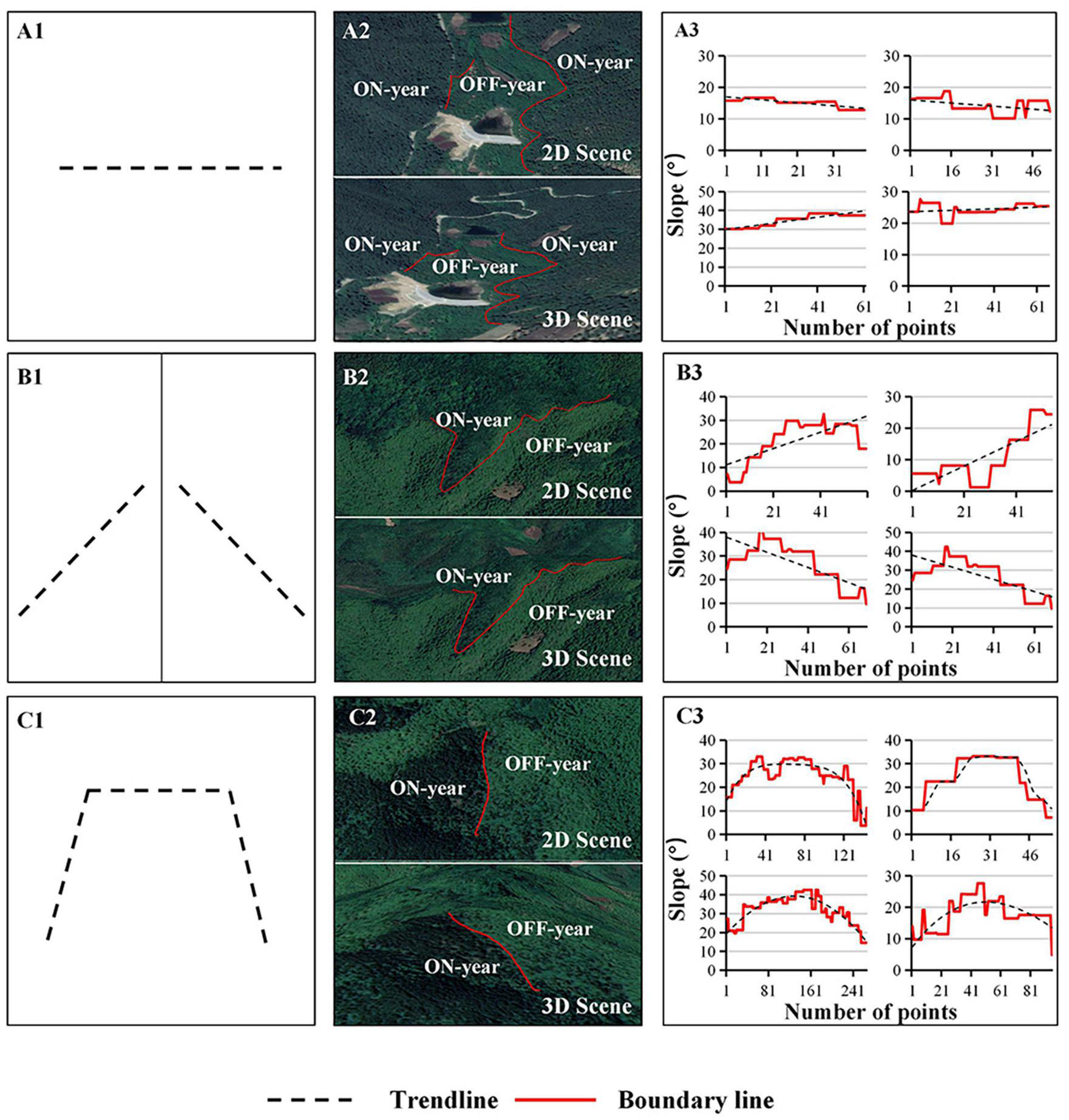 Horizontal view of the on-/off-year boundary variation in slope. (A1–A3) Series represent stable type, (B1–B3) series represent single-change (ascending or descending) type, (C1–C3) series represent trapezoidal type. Series1 represent spatial type, series2 represent 2D/3D Scene, series3 represent diagram of typical boundary changes.