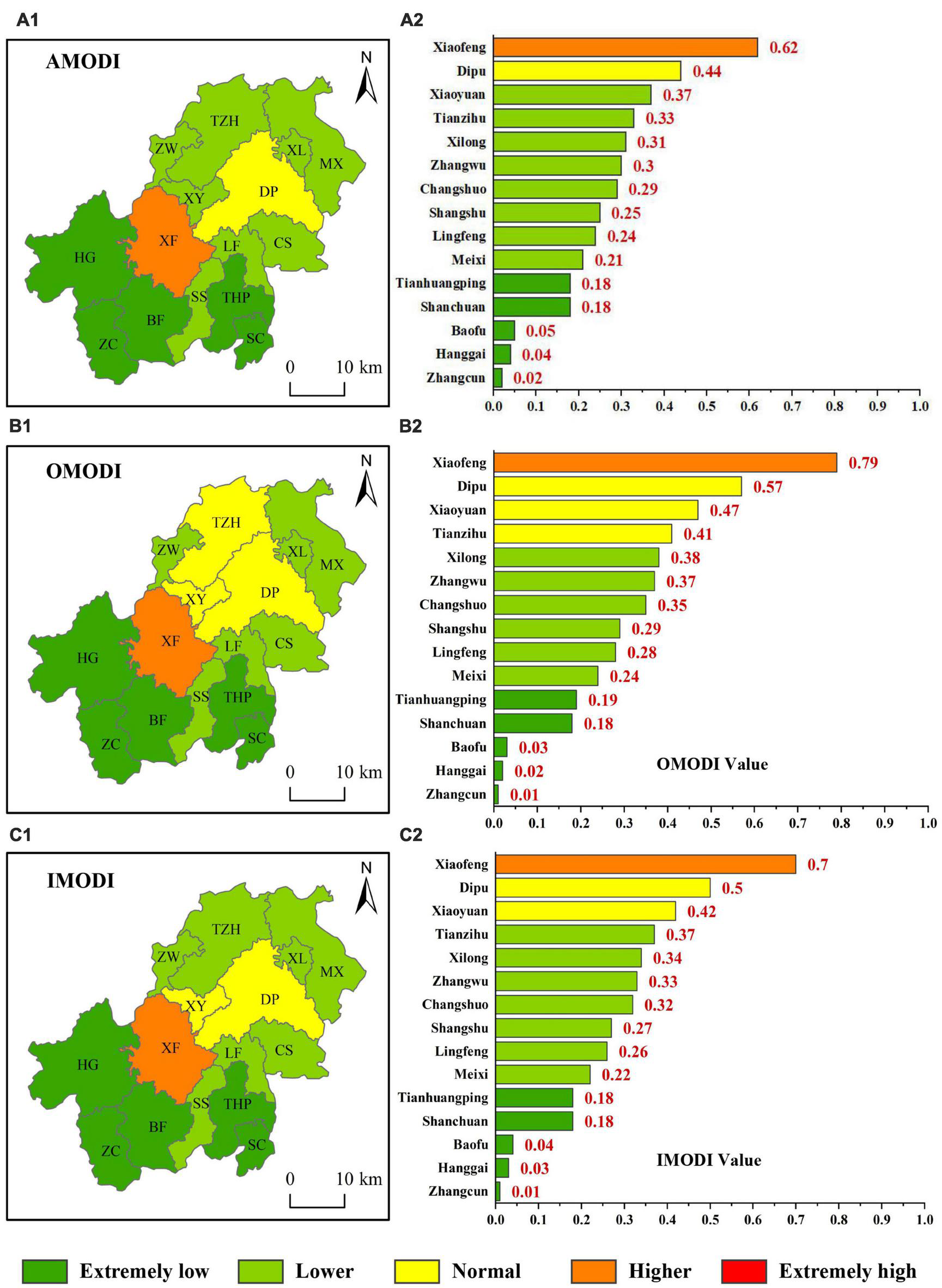 Spatial heterogeneity map of the AMODI, OMODI, and IMODI in Anji County. (A1,A2) Series represent map results of AMODI, (B1,B2) series represent map results of OMODI, (C1,C2) series represent map results of IMODI. Series1 represent spatial heterogeneity map, series2 represent index value for each township.