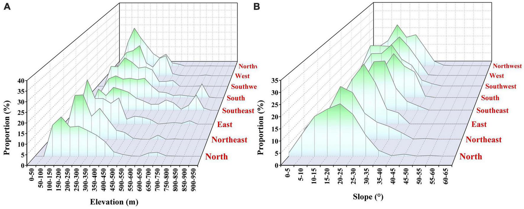 Frequency distribution of boundary line elevation and slope along different slope directions. (A) Elevation proportion at different direction, (B) slope proportion at different direction.