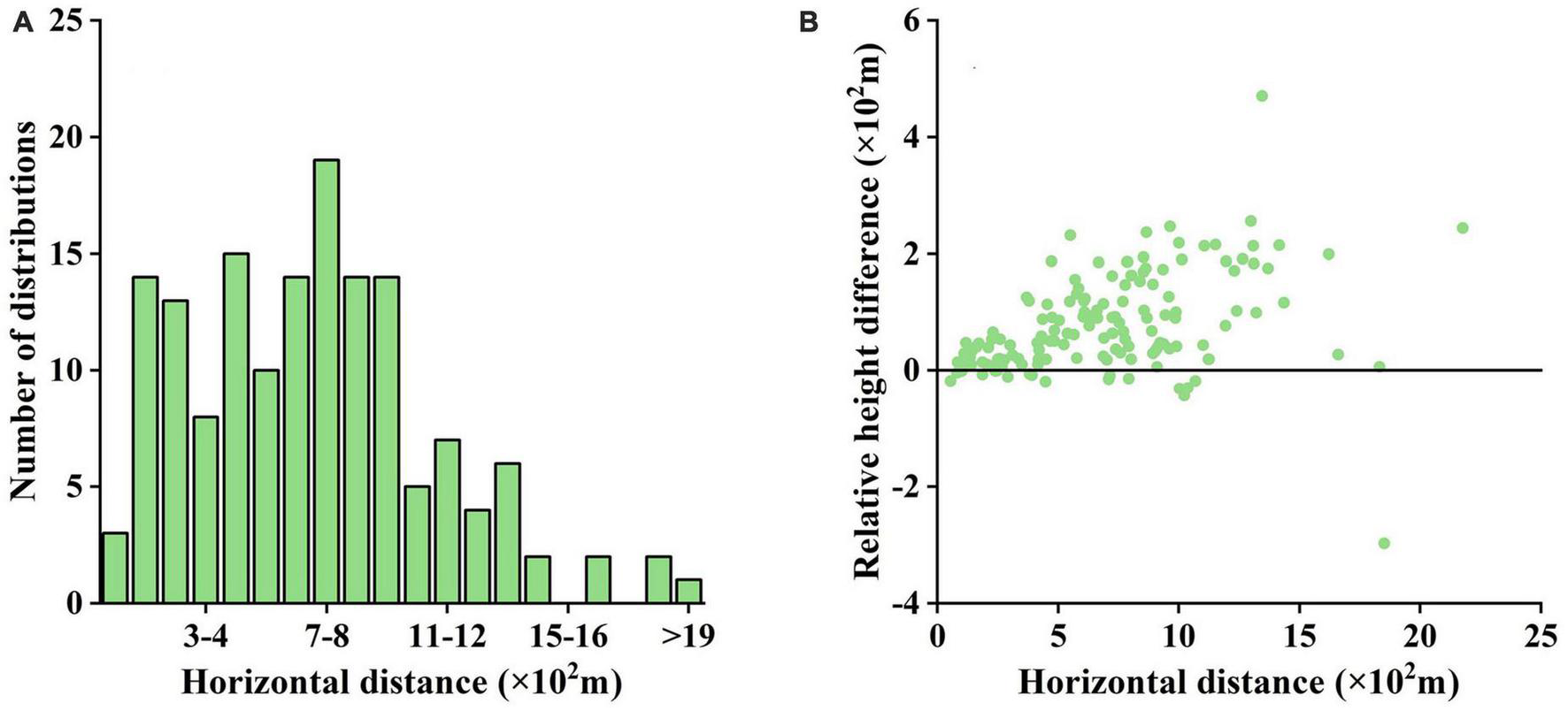 Distance analysis between locations of human activity and on-/off-year boundary lines. (A) Horizontal distance distribution results from the lowest elevation point of the boundary line to the village, (B) the scatter plot of the distribution of relative height differences and horizontal distances.
