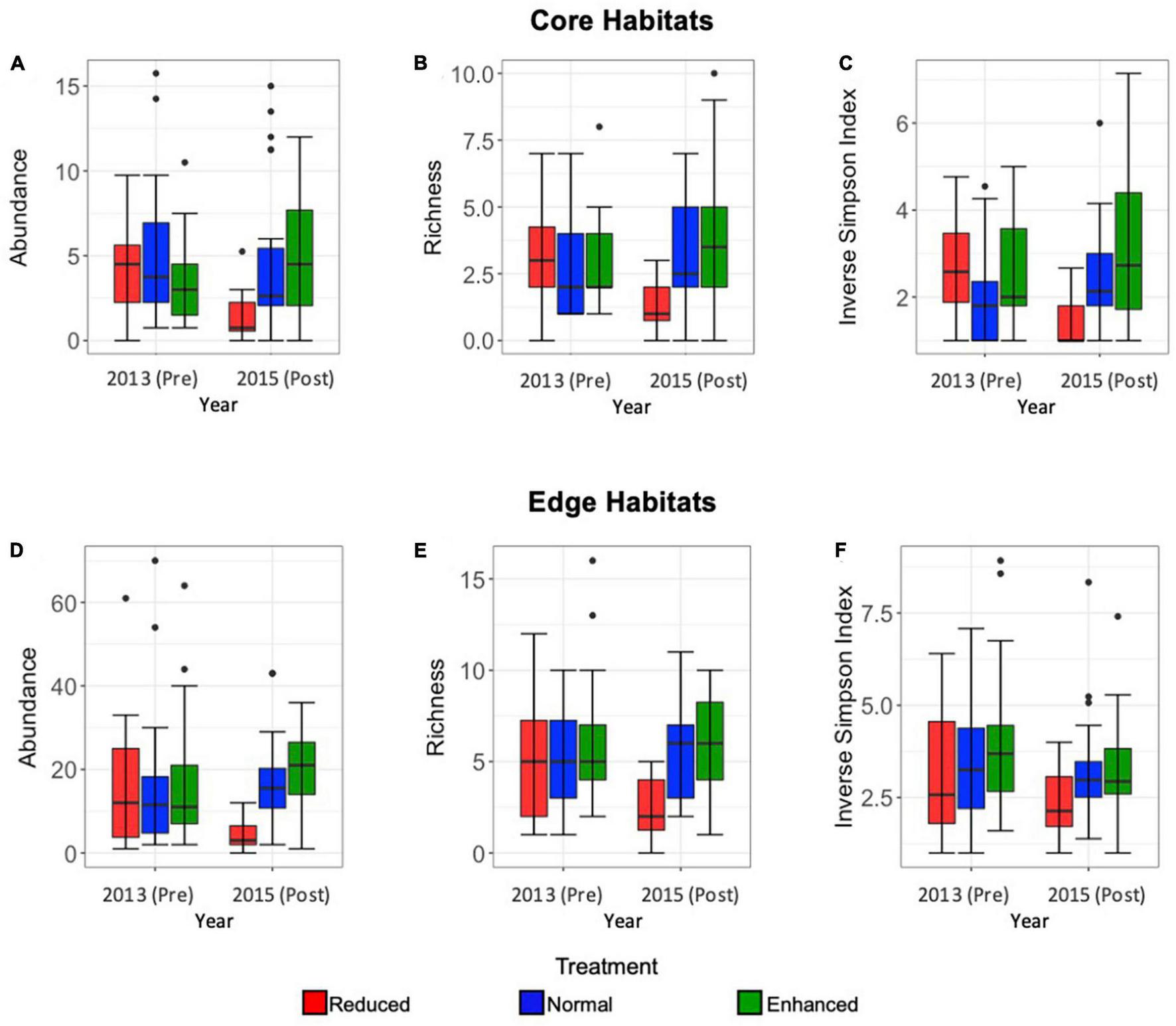 Figure 2. Box and whisker plots comparing Core habitat Lepidoptera mean abundance per transect (A), richness (at morphospecies level) (B), and inverse Simpson Index (C) in pre- (2013) and post- (2015) sites under Reduced (red), Normal (blue), and Enhanced (green) treatments, and Edge habitat Lepidoptera abundance (D), richness (at morphospecies level) (E), and inverse Simpson Index (F) in pre- and post-sites under Reduced (red), Normal (blue), and Enhanced (green) treatments over the long-term (2013–2015). Median, interquartile range, range, and outliers are given. Scales differ between Edge and Core plots.