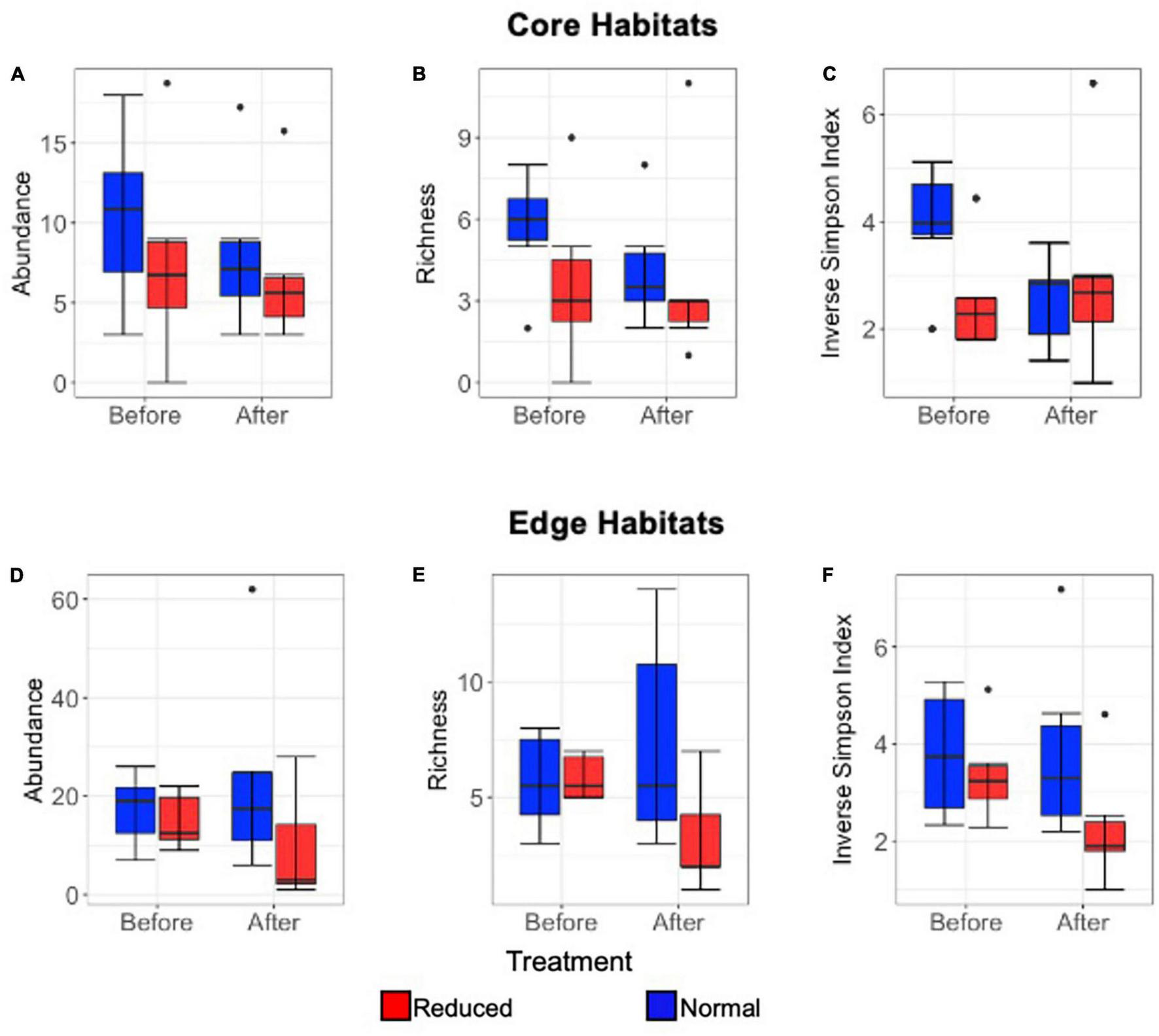 Figure 4. Box and whisker plots comparing short-term (2014 only) Lepidoptera mean abundance per transect (A), richness (to morphospecies level) (B), and inverse Simpson Index (C) immediately 2014-Pre and 2014-Post application of Reduced (red) and Normal (blue) treatments (A–C) in Core habitats, and in Edge habitats for mean abundance per transect (D), richness (to morphospecies level) (E), inverse Simpson Index (F). Median, interquartile range, range, and outliers are given.