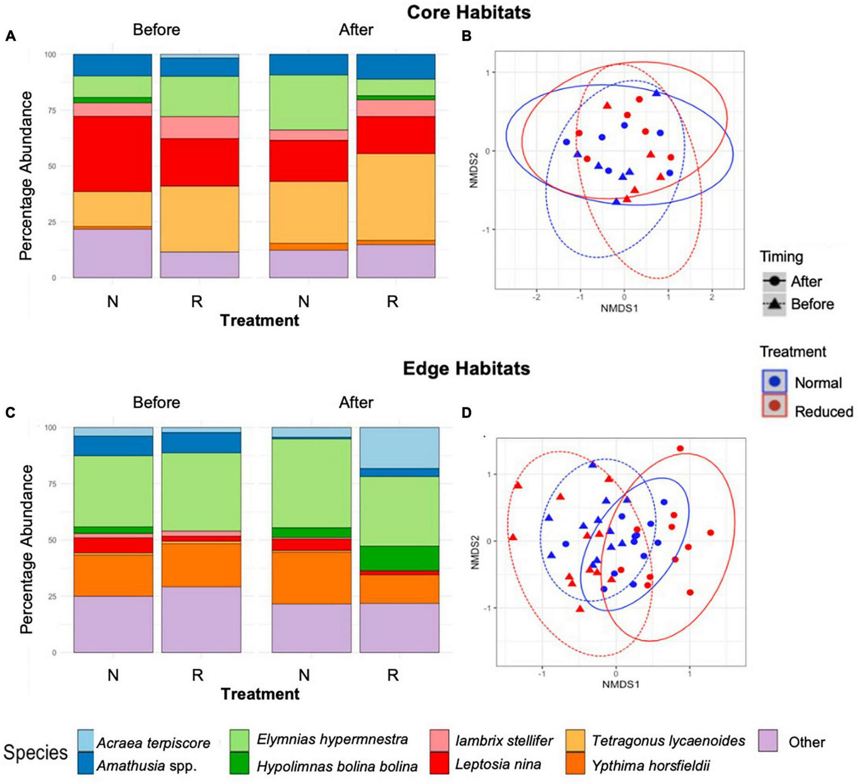 Figure 5. Stacked bar charts showing short-term (2014) percentage abundance by species for Core (A), and Edge (C) sites immediately before and after treatment implementation across the Normal (N) and Reduced (R) treatment types. Results of non-metric multidimensional scaling, showing the effects of time period and treatment type on species composition of butterflies and moths in Core (B) and Edge (D) habitats. Points are spherically grouped by plot type (Pre-treatment Reduced, Pre-treatment Normal, Pre-treatment Enhanced, and Pre-treatment Reduced), based on a 98% confidence interval, using a Bray–Curtis dissimilarity matrix with 999 permutations (stress = 0.09).