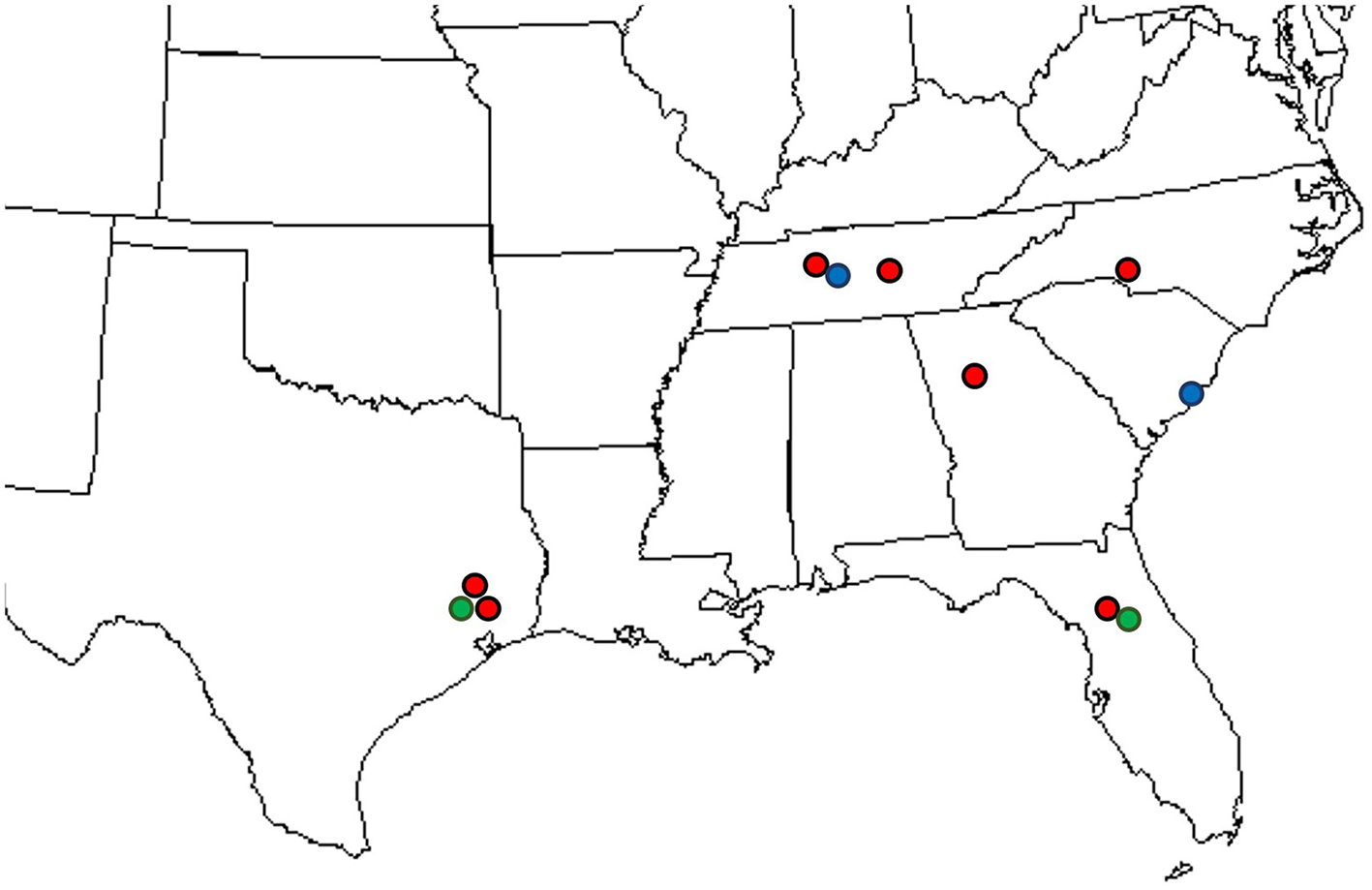 Locations where IHLR was sampled across the southeastern United States: red dots on Carpinus caroliniana, blue dots on Carpinus betulus, and green dots on Ostrya virginiana hosts.