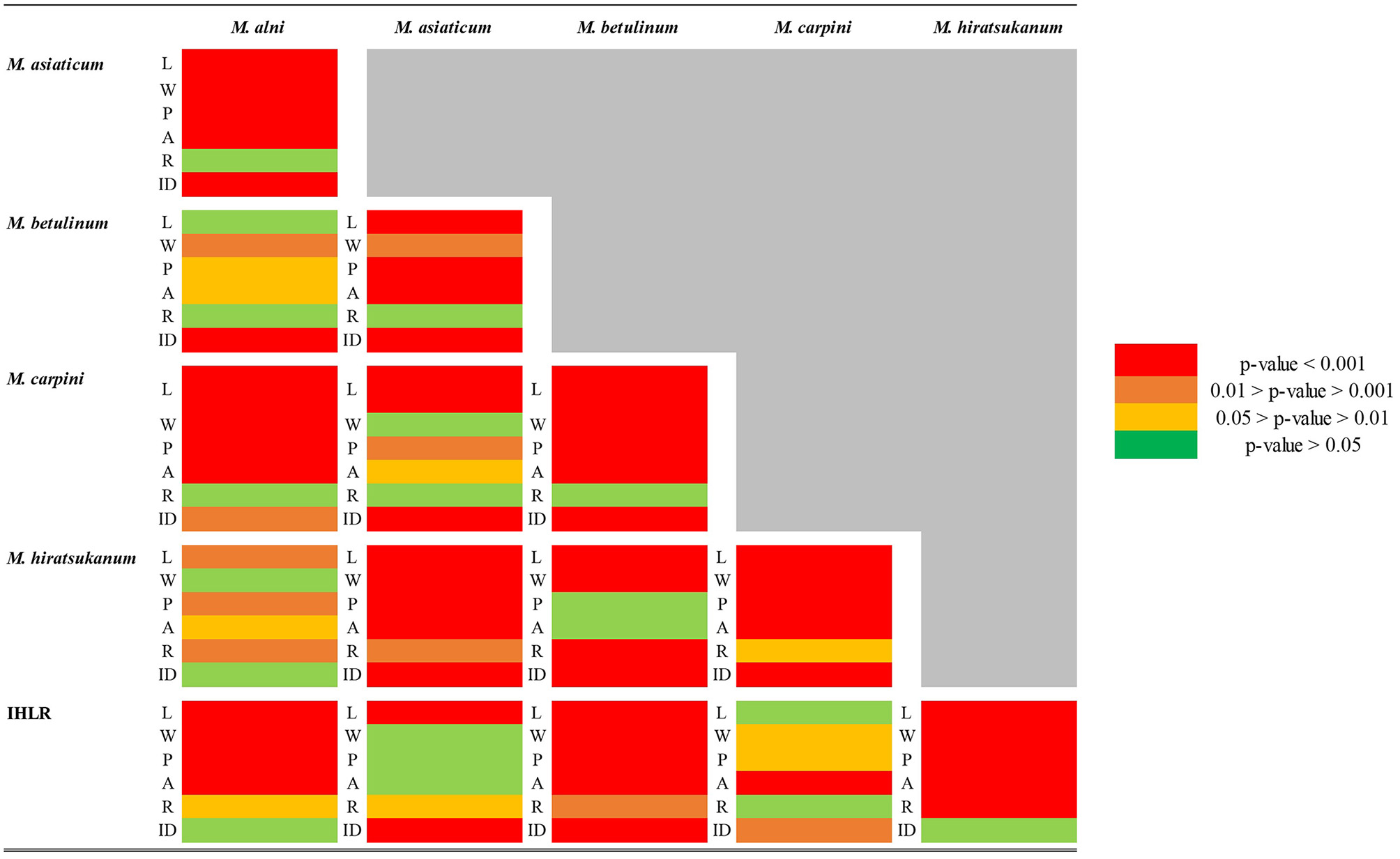 Pairwise comparisons of morphological traits between every recognized species in the genus Melampsoridium revealed diagnostic features and allowed for the observation of morphological affinities. Urediniospore length was statistically different for all taxa except between IHLR and M. carpini specimens (Welch t-test p-value on log10 transformed data = 0.6724) and between M. alni and M. hiratsukanum specimens (Welch t-test p-value on log10 transformed data = 0.3875). Urediniospore width is diagnostic for most taxa but could not discriminate between M. alni/M. hiratsukanum (Welch t-test p-value = 0.2966), M. asiaticum/M. carpini (Kruskal–Wallis p-value = 0.3875), and IHLR/M. asiaticum (Welch t-test p-value = 0.7023). Urediniospore perimeter and area in a similar way segregate all taxa combinations except M. betulinum/M. hiratsukanum (Kruskal–Wallis p-value = 0.1169 and Welch t-test p-value = 0.8450, respectively) and IHLR/M. asiaticum (Welch t-test p-values = 0.2517 and 0.9047, respectively). The urediniospore roundness trait significantly discriminates species in only 7 out of the 15 possible combinations in the genus and does not appear to be a reliable diagnostic tool by itself. Statistical differences and similarities among taxa in pairwise comparisons are presented in a heat map (Figure 3). A more detailed heat map including p-values is presented in Supplementary Figure 3. Its visual observation allows a preliminary interpretation of the morphological affinities of the different taxa within the genus, i.e., taxa with comparable traits. The overall size of the spores (area) is comparable for M. hiratsukanum (286.67 μm2) and M. betulinum (288.19 μm2) (Welch t-test p-value = 0.8450). However, the specimens from these two taxa differ in their length (Welch t-test p-value on square root transformed data = 1.35 E-05, 5.163664 and 5.436891 values, respectively) and width (Welch t-test p-value = 0.0002, 13.82 μm and 12.76 μm values, respectively). Specimens of M. alni (13.98 μm) and M. hiratsukanum (13.81 μm) are similar in terms of width (Welch t-test p-value = 0.6823). Their overall size (area) is also not statistically different at a 1% significance level (Welch t-test p-value = 0.0218, 319.71 μm2 and 288.19 μm2 values, respectively). Finally, M. alni and M. betulinum specimens have comparable lengths as explained above with log10 transformed average measurements of 1.46 and 1.47, but also area values that are not statistically different at a 1% significance level (Welch t-test p-value = 0.0156, 319.71 μm2 and 286.67 μm2 values, respectively).