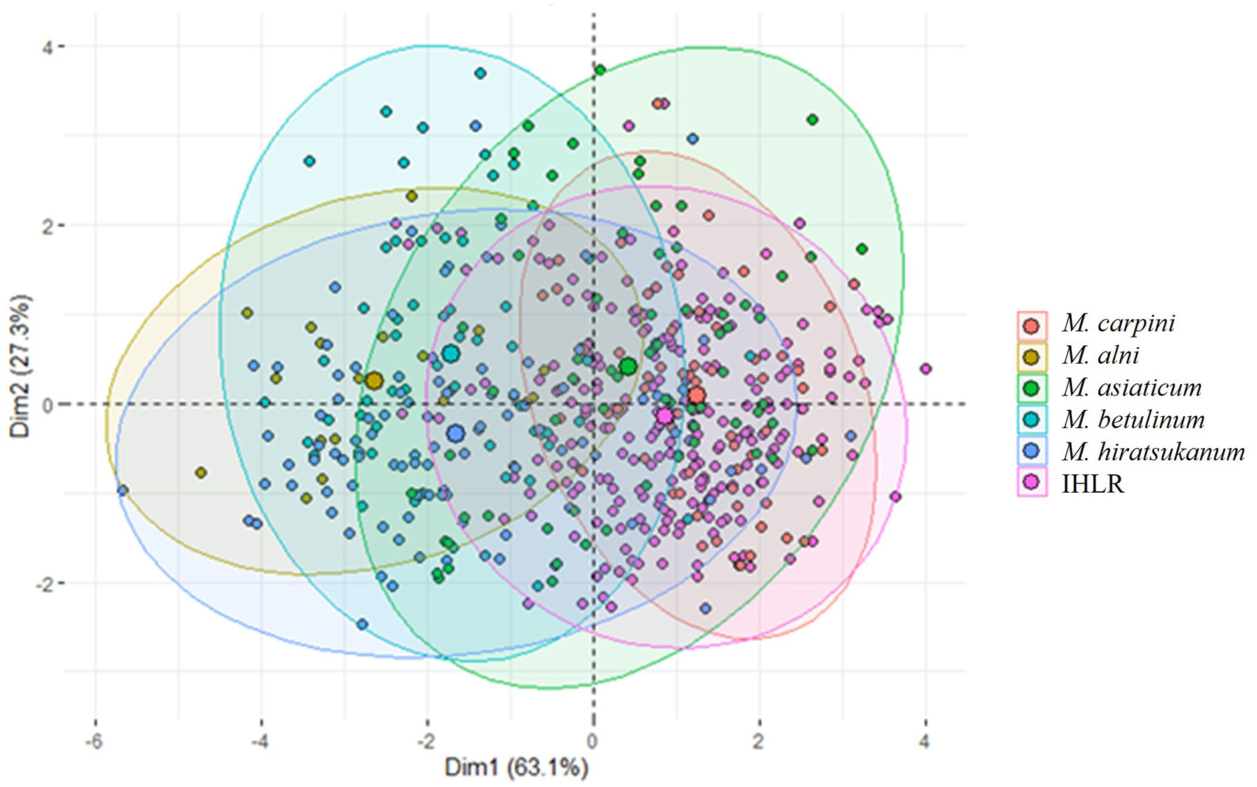 In this context, we propose the designation Melampsoridium cf. asiaticum to refer to IHLR specimens. The two groups (IHLR and M. asiaticum specimens) have Ostrya and Carpinus species as hosts; quantitative morphological traits (urediniospore width, perimeter, and area) are statistically similar; and no gametophyte host has been observed for IHLR and M. asiaticum specimens. However, a few discrepancies are noted (e.g., urediniospore length feature), and nuclear ITS and LSU sequences differ as well (13 polymorphic sites total), resulting in IHLR and M. asiaticum specimens being sister subclades in the topology of the reconstructed phylogeny. Additional DNA information and sequences at the genus level would allow the better phylogenetic signal resolution needed to confirm IHLR identity. The denomination Melampsoridium cf. asiaticum is justified by these discrepancies, which may be due to local adaptation following introduction from Asia or correspond to the characteristics specific to an emergent, novel taxon in the genus.