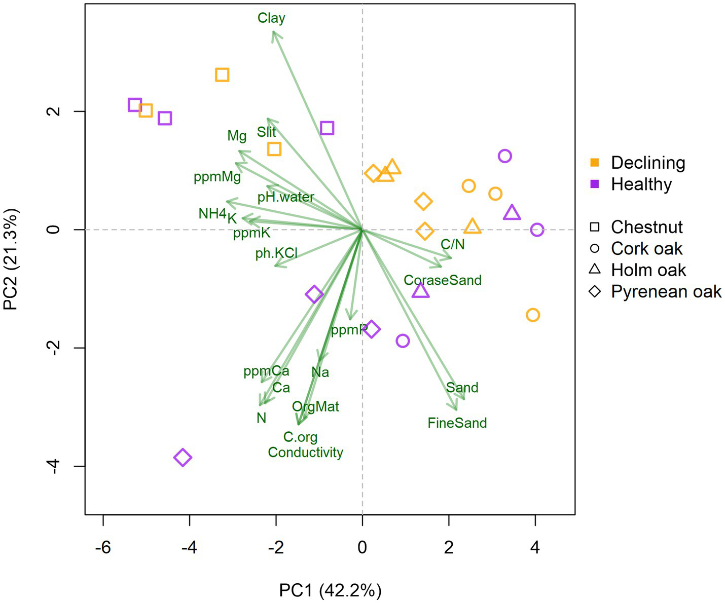 Biplot of soil properties, tree species and health status. Green arrows represent soil properties and colored symbols represent soil samples. Axis correspond to the first and second principal components, accounting for 63.5% of total variance. Variables were scaled prior to analysis.