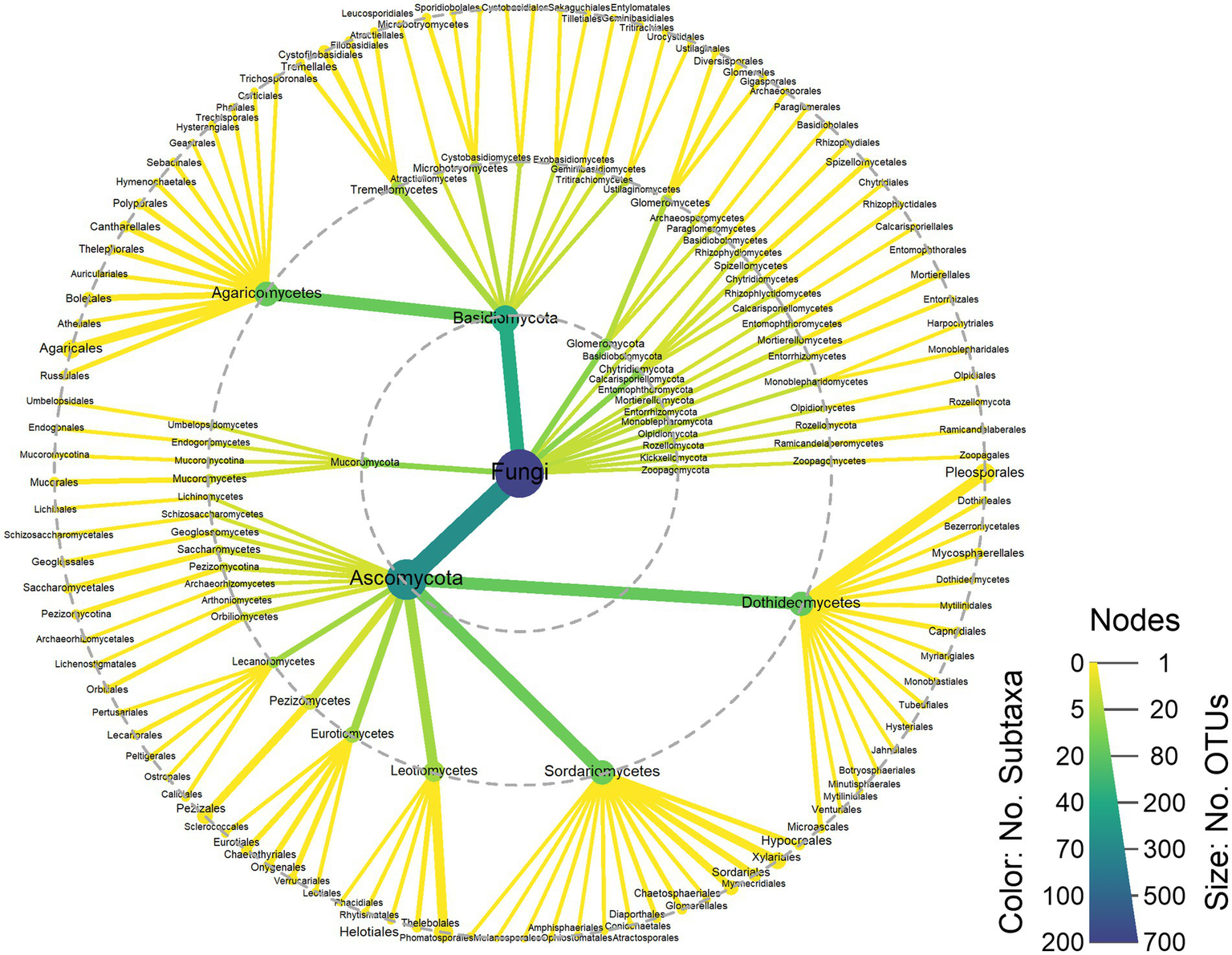 Taxonomic heat tree. Node size represents the number of OTUs and color scale represents the number of subtaxa. Dashed grey circles indicate the following taxonomic levels: phylum (inner), class (middle), order (outer). NA: not assigned.
