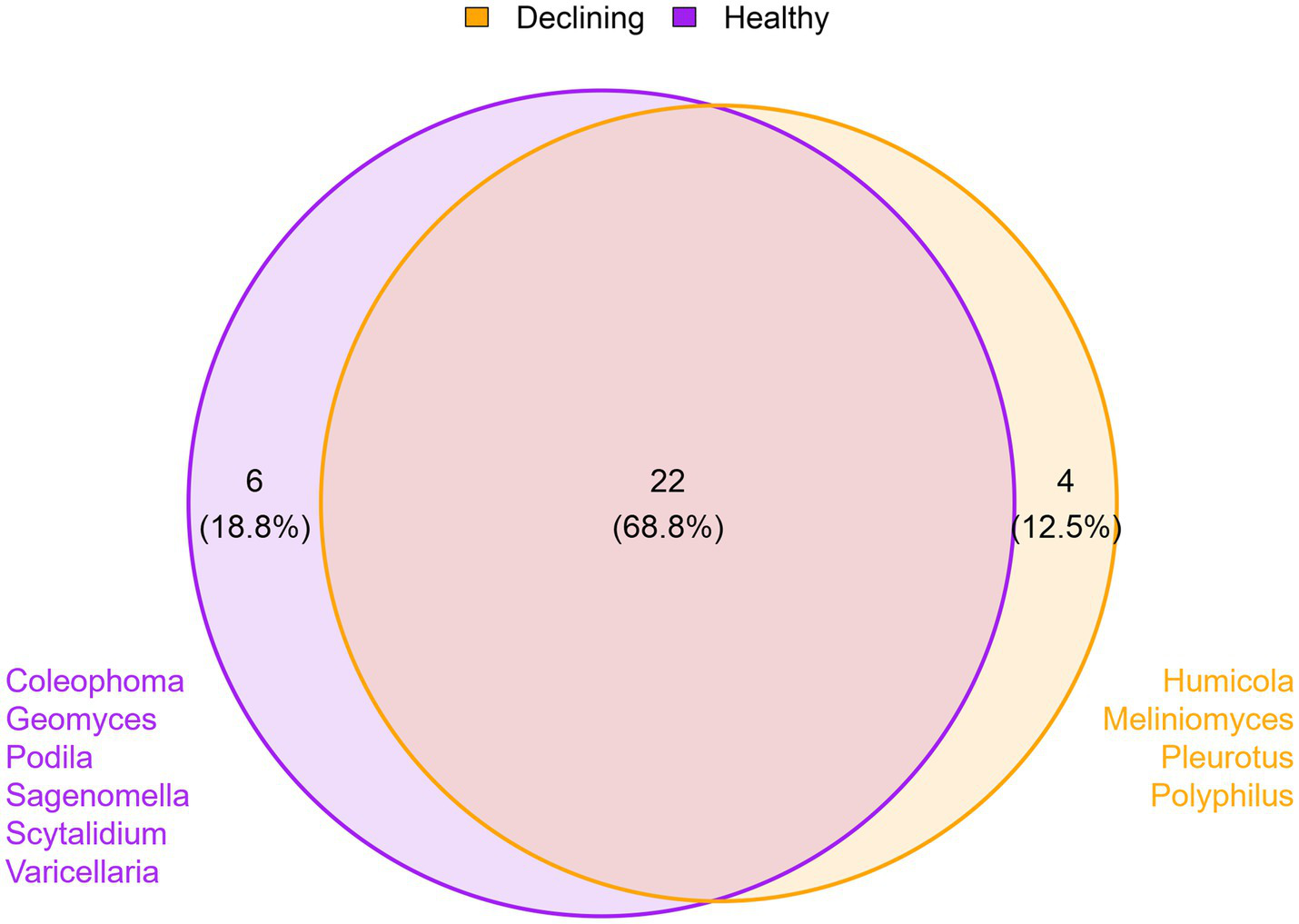 Overall effect of health status on mycobiota. Venn’s diagram showing the number of common and exclusive genera between samples from healthy (n = 12) and declining (n = 12) trees. Only genera present in 80% of samples per condition are included, regardless of tree species.