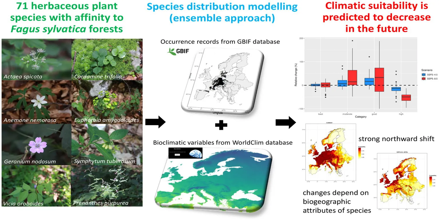 Continental-scale species distribution modelling approach was used in this study to predict potential distributional shifts for 71 herbaceous plant species across European forest biomes using two climate change scenarios. The selected species are considered as diagnostic species having an ecological optimum in European Fagus sylvatica forests (reference list compiled by Willner et al., 2009). This selection deliberately included widespread forest herbs as well as species with central geographic distribution in the Alpine-Dinaric beech forests because species in southern parts of Europe are presumed to be more vulnerable to climate change due to the vicinity of Mediterranean climate and associated decrease in summer precipitation. We addressed the following research questions: (i) Are beech forest plant species predicted to lose or gain climatic suitability in Europe in the future? (ii) Is the climatic suitability of selected species shifting toward higher latitudes and/or elevations? (iii) Can the potential range shifts be explained by species’ biogeographic and climatic niche attributes? It is important to provide additional insights into how will forest herbs behave in the southern edges of distributional range and how they could be maintained there. While high-elevation mountainous areas with complex topography will likely provide crucial refugia for heat- and drought-sensitive forest herbs in the future, the peripheral southern distribution populations of Fagus sylvatica (especially in the southern European Peninsulas) can function also as reservoirs for understory species less tolerant to winter cold.