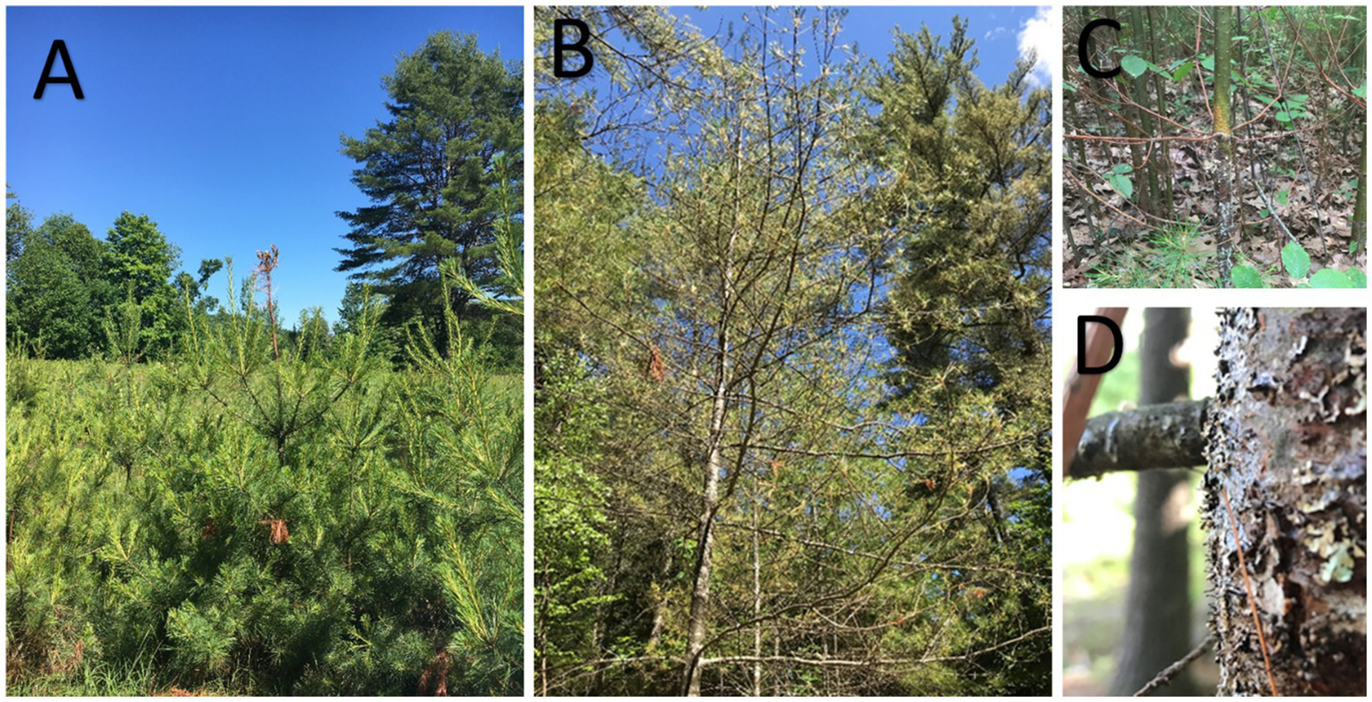 Eastern white pine regeneration in southern Maine and New Hampshire with signs and symptoms of insects and (A) white pine weevil (Pissodes strobi), (B) chlorosis and defoliation caused by Lecanosticta acicola, (C) white pine blister rust stem canker caused by Cronartium ribicola, and (D) fruiting bodies of Caliciopsis pinea protruding from a branch whorl.
