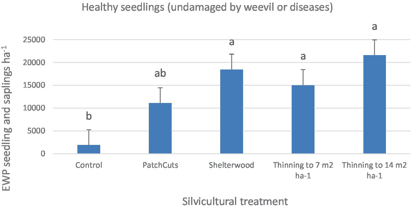 Density of undamaged eastern white pine regeneration in different treatments. Bars represent the mean and standard error for plots within each treatment. Values with the same letter are not statistically different (α = 0.05).