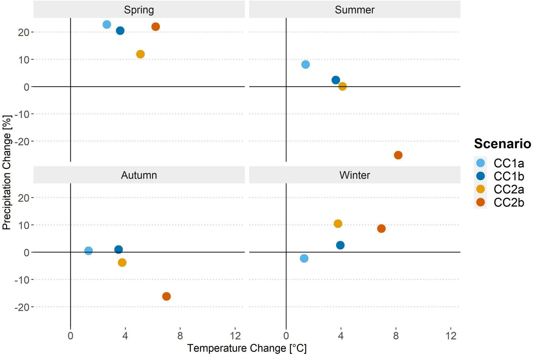 Future climate change scenarios were derived from CHELSA V2.1 (Karger et al., 2017, 2020). This dataset provides a preselected, bias corrected combination of downscaled global climate models (GCMs) and emissions scenarios driven by different socioeconomic assumptions, so-called shared socio-economic pathways (SSPs), from the Coupled Model Intercomparison Project Phase 6 (Karger et al., 2021). We selected two out of the five featured GCMs in CHELSA, GFDL-ESM4 and UKESM1-0-LL, as they were given the highest priorities following the ISIMIP3b protocol. Priority was assessed according to the models’ performance in the historical period (1850–2014), as well as availability of required data (Lange, 2021). We then selected two scenarios as representative for moderate and severe climate change, namely SSP1-RCP2.6 and SSP3-RCP7 (O’Neill et al., 2017). We excluded SSP5-RCP8.5 as it is often deemed as highly unlikely worst case scenario that has recently caused controversy and debates among scholars on its application in simulation models (Hausfather and Peters, 2020; Hausfather et al., 2022). CHELSA provides 30-year averages of monthly temperature and precipitation for different time periods (1981–2010, 2011–2040, 2041–2070, and 2071–2100) at 1 km spatial resolution. For each scenario and model we calculated the differences in seasonal mean temperature and precipitation between subsequent 30-year periods, using the last period as reference for the next one and including the historical period (1981–2010) which was used as the first reference period. Lastly, season-specific delta values for each future climate scenario were used as inputs for the simulation. When the long-term changes for 2071–2100 were computed with respect to current conditions (1981–2010), all future scenarios and models showed temperature increases in all seasons, while shifts in precipitation varied depending on the scenario and season (Figure 2). Climate change scenarios were ranked and renamed as “CC1” for SSP1 and “CC2” for SSP3, with letters indicating the climate model (a = GFDL_ESM4; b = UKESM1-0-LL).
