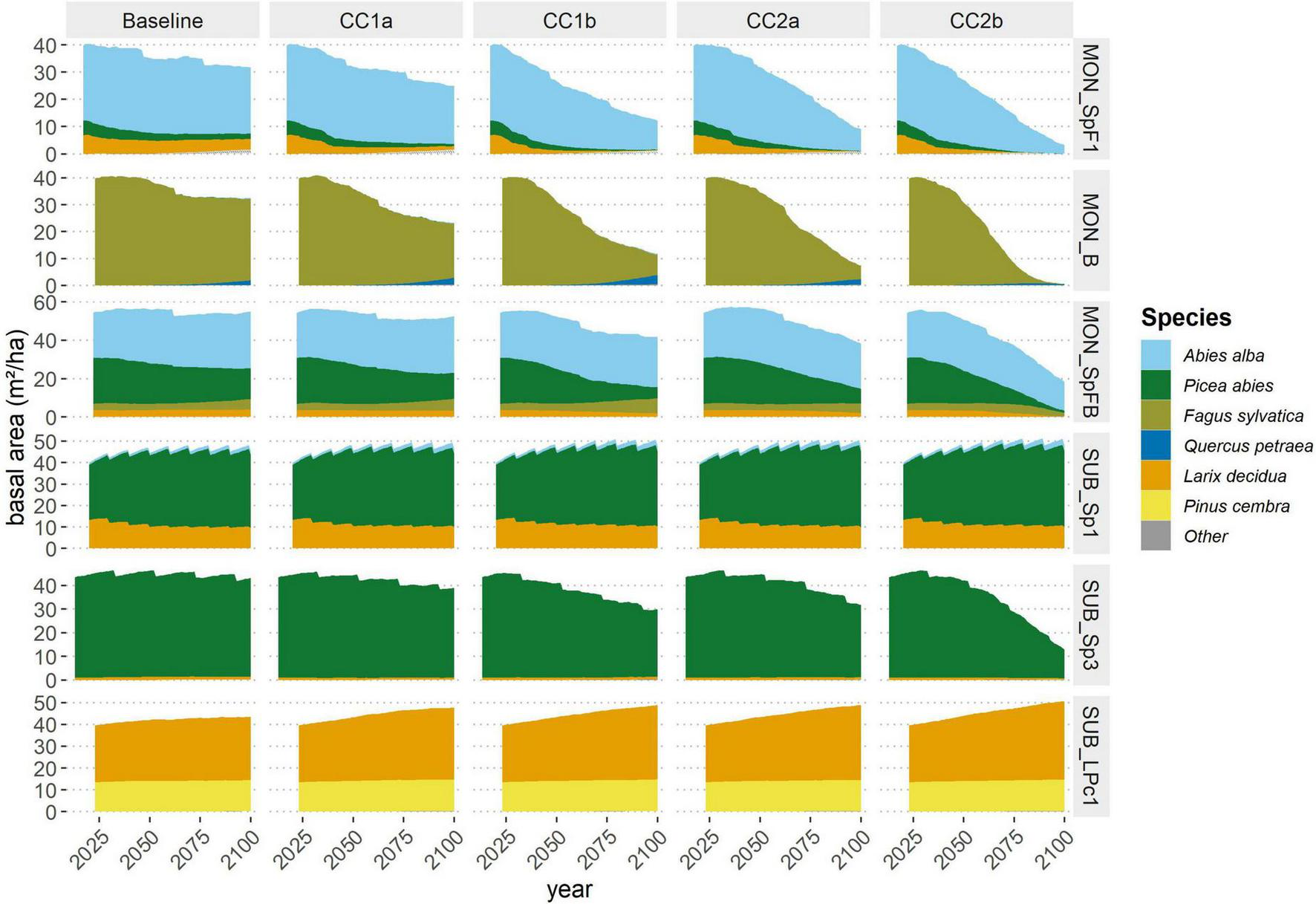 Temporal pattern of species-specific changes in basal area differed substantially among sites (Figure 4 and Supplementary Figure 6), especially due to differences in initial species composition. Although we did not observe drastic changes in projected species composition across our forest stands, some species were more affected by climate change than other. This, however, differed depending on the site and climate scenario. For example, European larch in MON_SpF1 and MON_SpFB persisted until 2100 under baseline climate, but it gradually declined until being completely absent from those stands under climate change, with steepest reductions observed under severe climate change.
