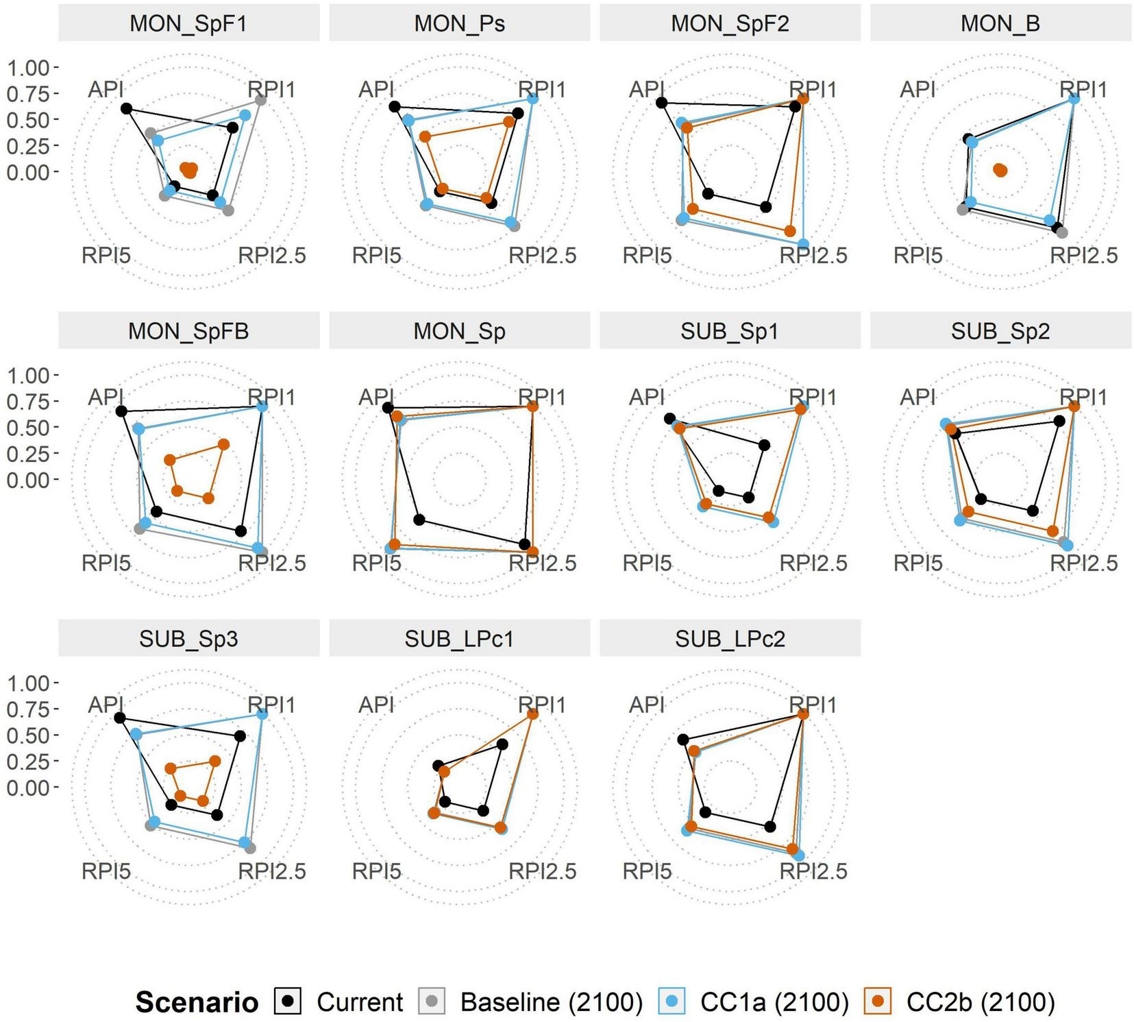 All montane sites experienced a decline in avalanche protection under climate change (Figure 5 and Supplementary Figure 8). API was generally higher under current conditions and was projected to decrease in the future under baseline climate and climate change scenarios. Severe climate change (CC2b) often induced drastic reductions of avalanche protection, as in sites MON_SpF1, MON_SpFB and MON_B (API as low as 0.03 in 2100 under CC2b) but not in site MON_Sp where API reductions were projected to be minimal. In the subalpine sites too, avalanche protection was generally higher under current conditions and was projected to reduce under climate change. While in some sites projected changes of the API were minimal (e.g., SUB_Sp1, SUB_Sp2) in others avalanche protection declined with intensifying climate change (SUB_Sp3). In one site (SUB_LPc1), API was very low also under current conditions (0.29), showing that the structure of this forest is at present time not suitable to protect against avalanches.