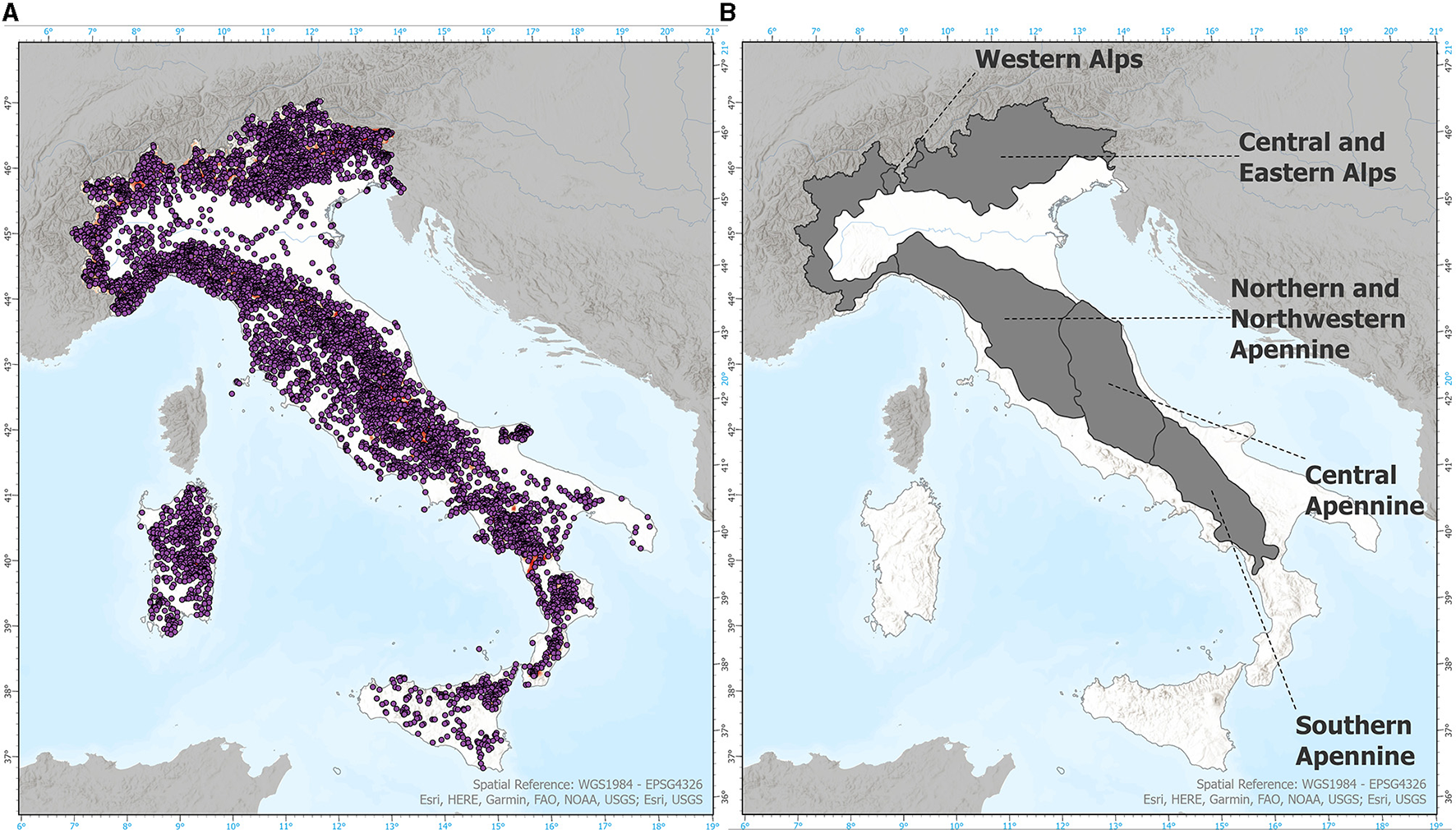 (A) Locations of INFC2005 samples. (B) Sections considered from the “Italian Ecoregion Map” dataset (Blasi et al., 2014, 2018).