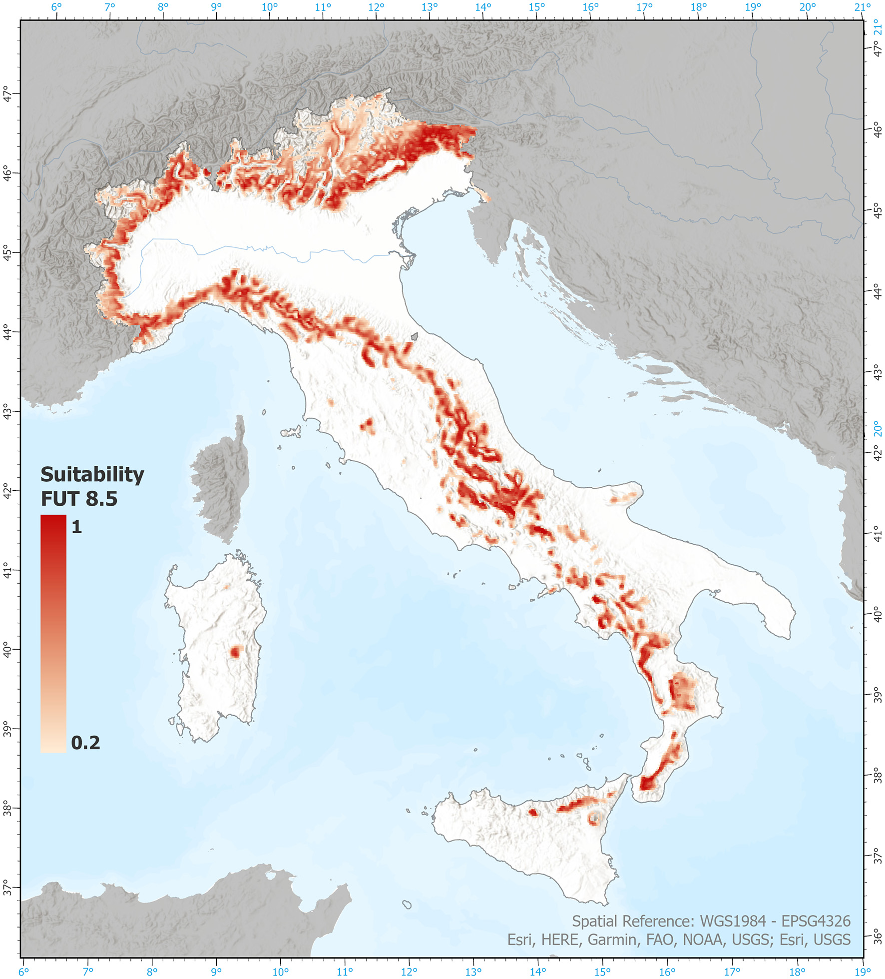 The generated suitability maps for the historical (4.5 and 8.5 scenarios) and future periods have a spatial resolution of approximately 2.2 km. Figure 2 displays as an example the predicted suitability specifically for the European beech under RCP 8.5 scenario.