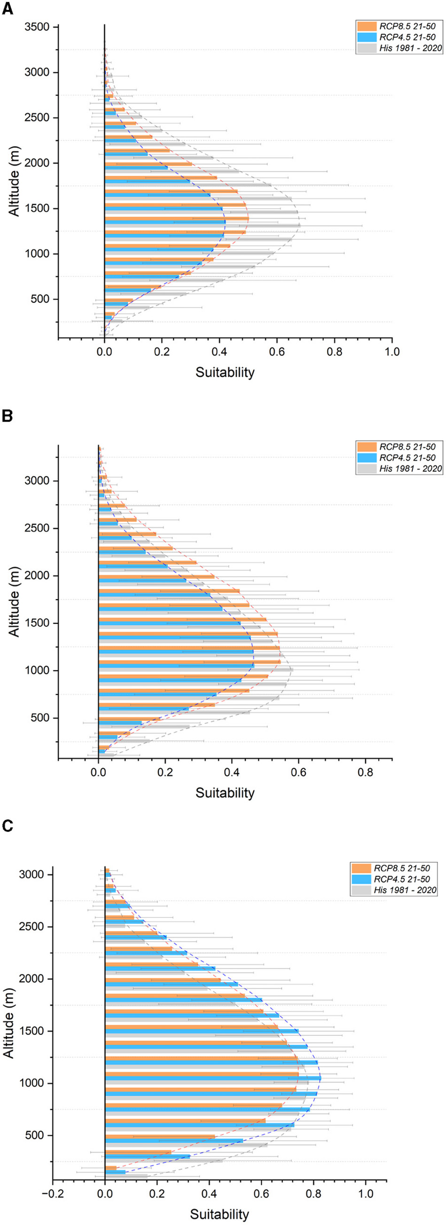 Suitability in altitudinal bands for the Western Alps section. In gray, historical (1981–2020); light blue, future RCP 4.5 (2021–2050); orange, future RCP 8.5 (2021-2050). (A) Chestnut (B) European larch (C) Norway spruce.