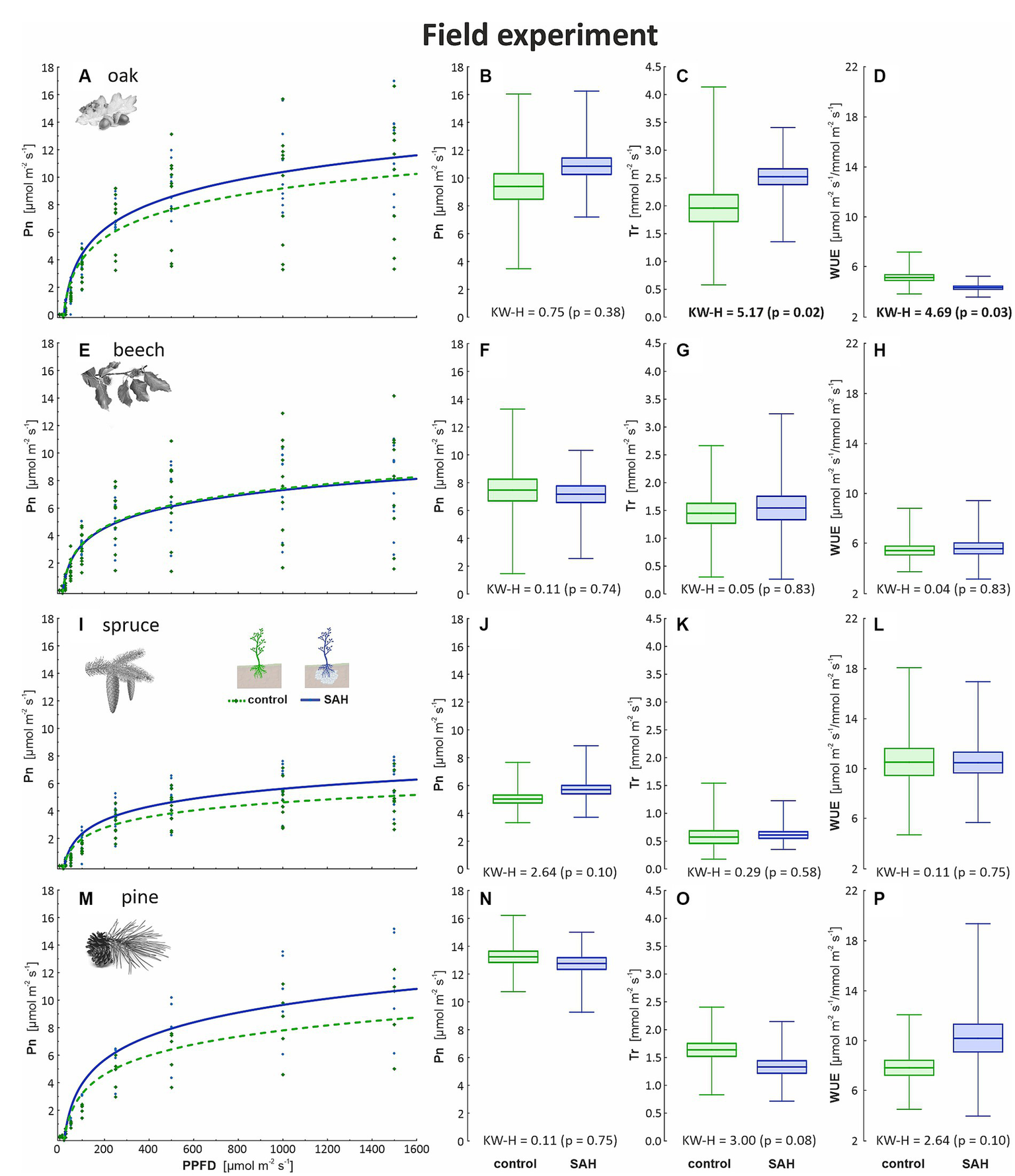 The results from the field and greenhouse experiments were congruent, as positive trends in Pn, Tr, and WUE in oak were recorded (Figures 2A–C), although the difference in Pn was not significant (Figure 2B). Furthermore, the quantum yield of photosynthesis was higher in the SAH-treated seedlings of both spruce and pine (Figures 2I,M). Overall, increased variability of the measured parameters in the field was observed but no clear trend was found for the SAH treatment in spruce and pine (Figures 2E–P). Almost identical data were recorded for all measured parameters in the control and SAH-treated beech samples (Figures 2E,F,G,H).