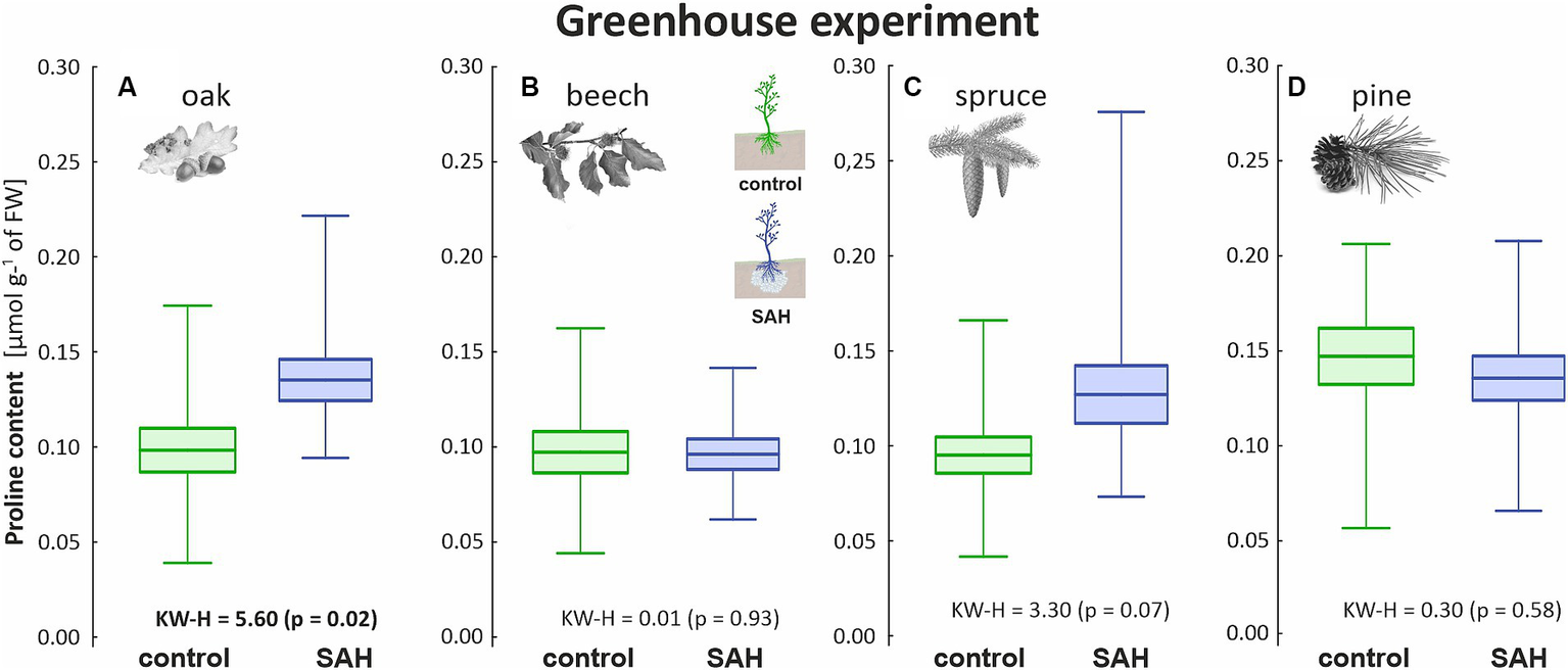 Proline content in the assimilation apparatus of superabsorbent hydrogel-treated (SAH) and control seedlings in the greenhouse experiment for (A) oak, (B) beech, (C) spruce, and (D) pine. Horizontal lines indicate the mean, standard error (box), and minimum and maximum values (whiskers); KW–H represents the Kruskal–Wallis test results, significant differences are in bold.