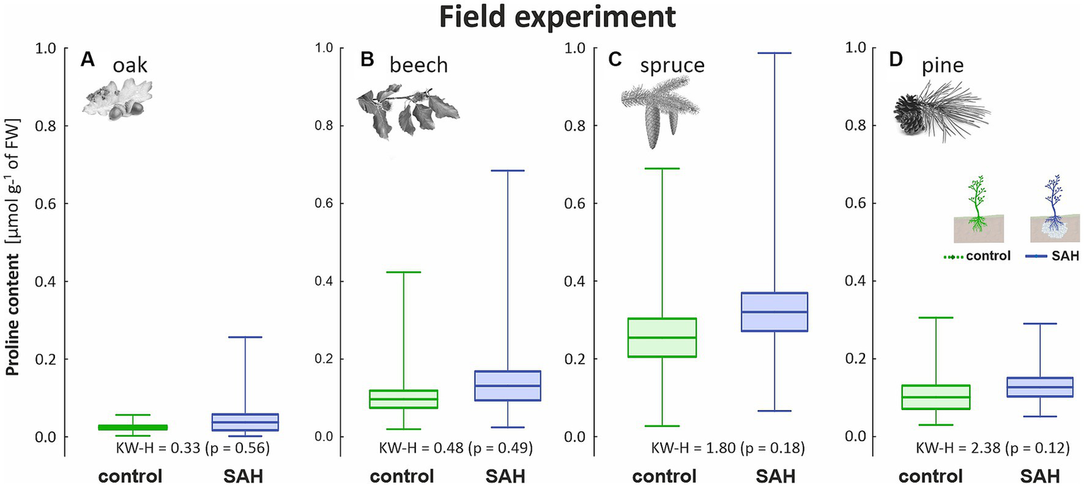 Proline content in the assimilation apparatus of superabsorbent hydrogel-treated (SAH) and control seedlings in the field experiment for (A) oak, (B) beech, (C) spruce, and (D) pine. Horizontal lines indicate the mean, box indicates the standard error and whiskers indicate the minimum and maximum values; KW–H represents Kruskal–Wallis test results—significant differences are in bold.