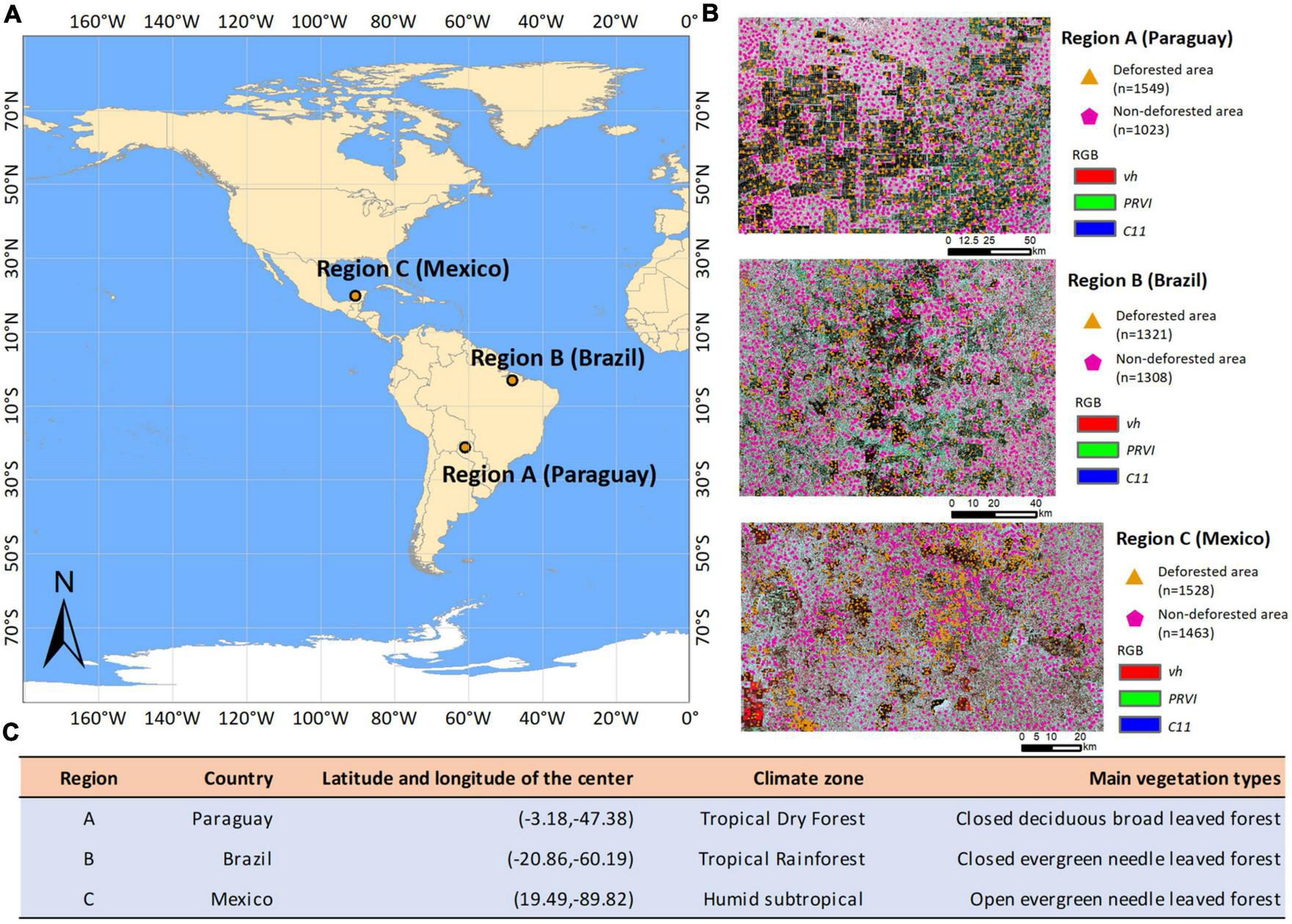 To ensure the applicability of the 3DC, we selected three study areas in Paraguay, Brazil, and Mexico (Figure 2). All three regions have high rates of forest cover and deforestation. Paraguay has a tropical dry forest climate with 54% forest cover. The dominant vegetation type of in Region A is closed deciduous broad-leaved forest. Brazil has 62% forest cover, accounting for one-fifth of the world’s forest area. Region B has a tropical rainforest climate, and the dominant vegetation type is closed evergreen needle-leaved forest. The eastern plain of Mexico has a subtropical humid climate, and open evergreen needle-leaved forest is the dominant vegetation type. The areas of regions A, B, and C are 180 km × 130 km, 150 km × 110 km, and 120 km × 70 km units, respectively.