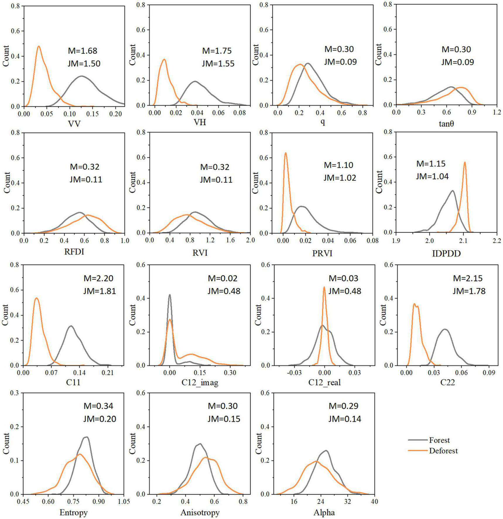 where μ1 and μ2 denote the mean values of forested and non-forested area, respectively. σ1 and σ2 denote the standard deviation of forested and non-forested area, respectively. When the value of M (JM) is greater than 1, it indicates good separability; otherwise, it indicates poor separability.
