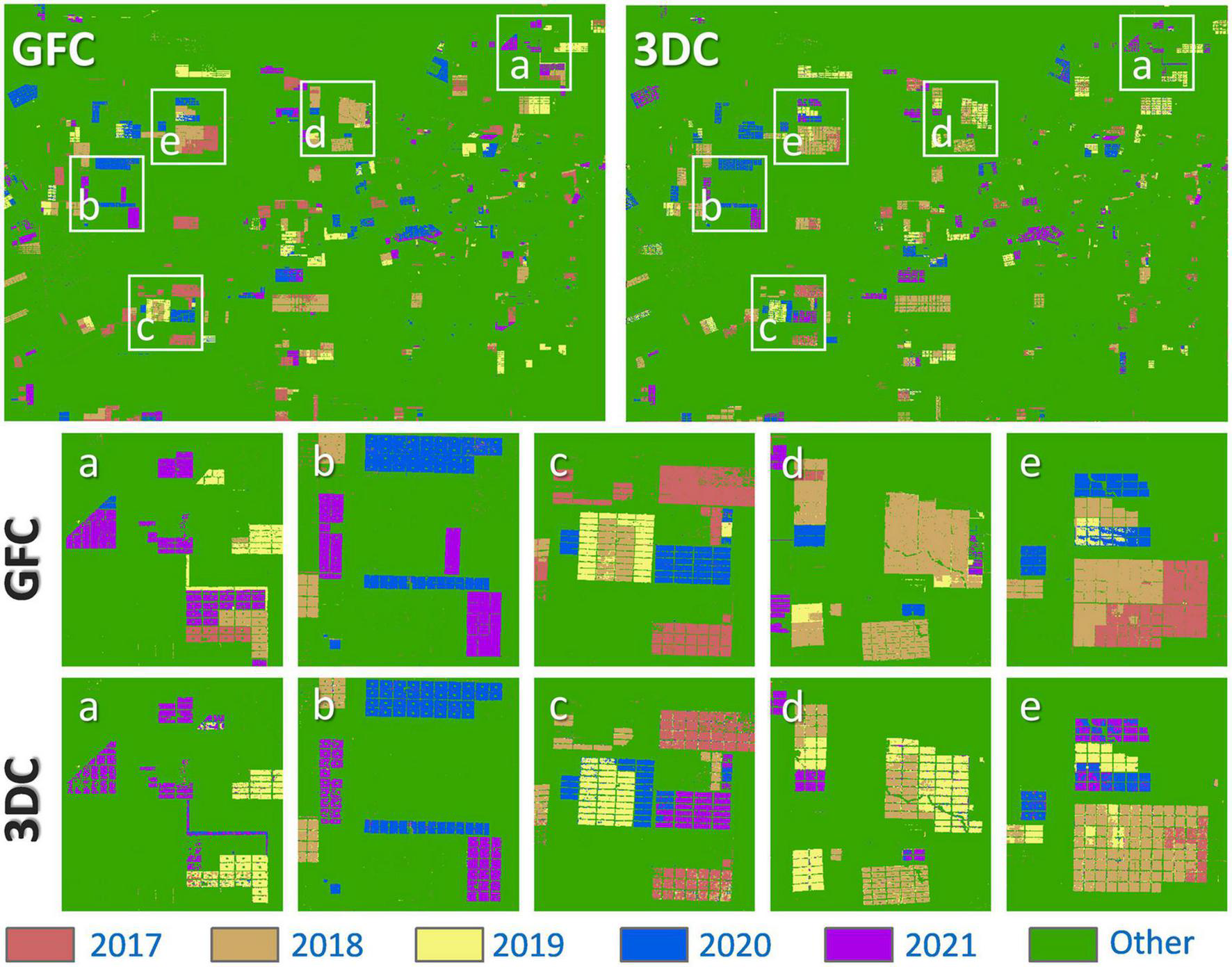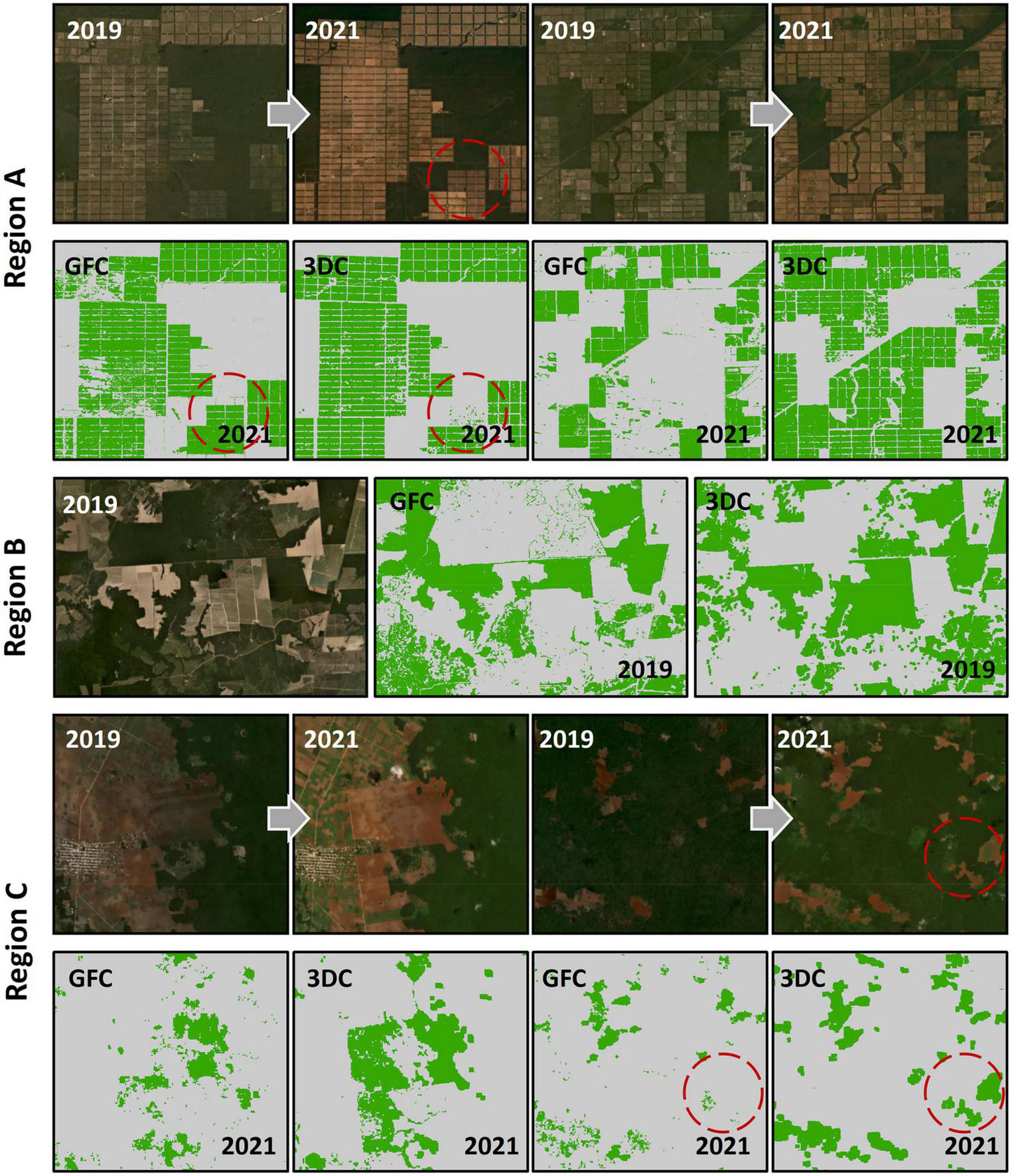 Visual comparison with the GFC maps further demonstrates the ability of the 3DC to detect deforestation. To obtain objective evaluation results, (1) the consistency of 3DC results with GFC products was tested in three study areas; and (2) the 3DC was applied to map the deforestation dynamics in Paraguay for 2021.