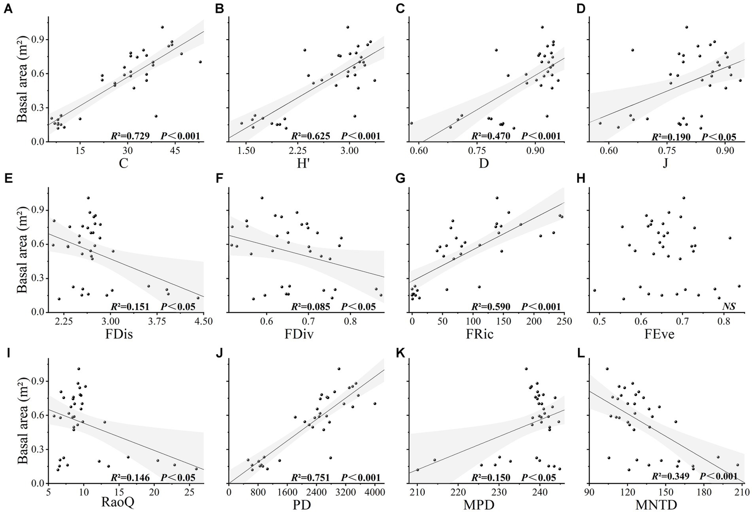 (A-L) The relationship between basal area and plant diversity in karst forest community. C, H, D, and J, respectively, represent species richness, Shannon index, Simpson index and evenness index in species diversity. FDis, FDiv, FRic, FEve, and RaoQ, respectively, represent the functional dispersion index, functional divergence index, functional richness index, functional evenness index, and Rao’s quadratic entropy index. PD, MPD, and MNTD, respectively, represent Faith’s phylogenetic diversity, mean pairwise phylogenetic distance, and mean nearest taxon phylogenetic distance.