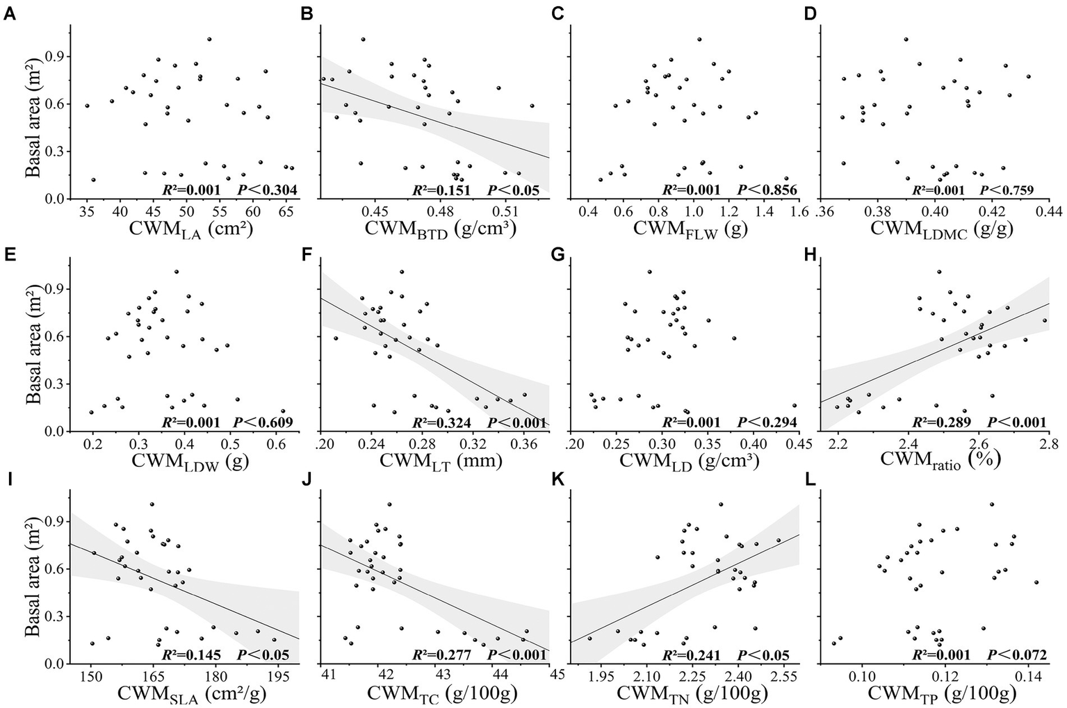 (A-L) Relationship between basal area and CWM of leaf traits in karst forest community. CWM represents the community-weighted mean of traits. LA leaf area, BTD branch tissue density, FLW fresh leaf weight, LDMC leaf dry matter content, LDW leaf dry weight, LT leaf thickness, LD leaf density, ratio represents leaf length to width ratio, SLA specific leaf area, TC leaf total carbon content, TN leaf total nitrogen content, TP leaf total phosphorus content.