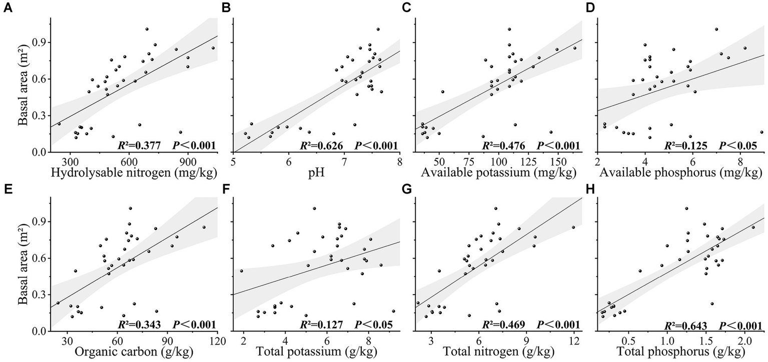 (A-H) The relationship between basal area and soil chemical properties in karst forest.