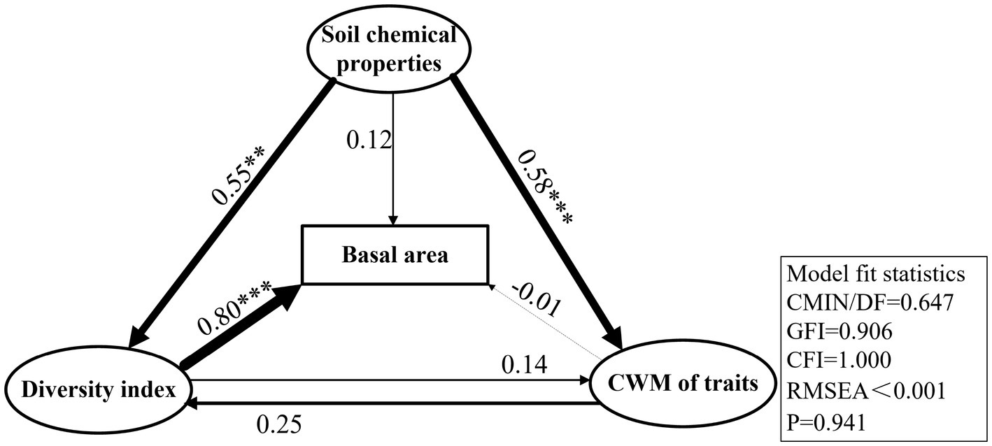 Species, functional, and phylogenetic diversities were all significantly correlated with the basal area of the plant community, among the indices of which, Faith’s phylogenetic diversity was found to have the greatest explanatory power for basal area. These plant diversity indices can better explain the variation in basal area than the CWM of traits, suggesting the niche complementarity hypothesis is more applicable than the mass ratio hypothesis. Moreover, soil chemical properties also have an equal important impact. Different chemical properties were found to show significant positive correlations with basal area, and their total effects on basal area were shown to be greater than the CWM of traits.