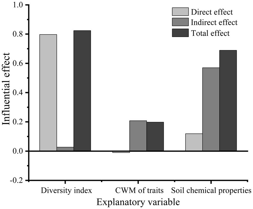 The species richness, Shannon, Faith’ phylogenetic diversity, and functional richness indices, which were established to be the most closely associated with basal area growth, were selected to represent plant diversity. Three CWM traits, namely, CWMratio, CWMSLA, and CWMTC, were found to be the most closely associated with basal area. Soil organic carbon, available phosphorus, and total carbon contents were selected as the main variables of soil chemical properties and included in the Structural equation modelling (SEM). The statistical values of the optimal model were as follows: CMIN/DF = 0.647, GFI = 0.906, CFI = 1.000, RMSEA < 0.001, and p = 0.941. SEM revealed that plant diversity indices had a highly significantly direct effect on the basal area (p < 0.001), with a path coefficient of 0.80. However, the CWM of traits had no significant direct effects on basal area (p > 0.05), for which the path coefficient was only −0.01 (Figure 5). The CWM of traits mainly had indirect effects on the basal area, mediated via plant diversity, with an indirect effect of 0.208. Soil chemical properties also influenced the change in basal area, which had an indirect influence on plant diversity and the CWM of traits, with a path coefficient of 0.57. The direct effect of soil chemical properties on basal area was also non-significant (p > 0.05), with a path coefficient of 0.12. The total effect (sum of the direct and indirect effects) of plant diversity on basal area was the largest, with total effect of 0.824. In addition, the total effects of soil chemical properties and the CWM of traits on basal area were 0.689 and 0.198, respectively (Figures 5, 6).