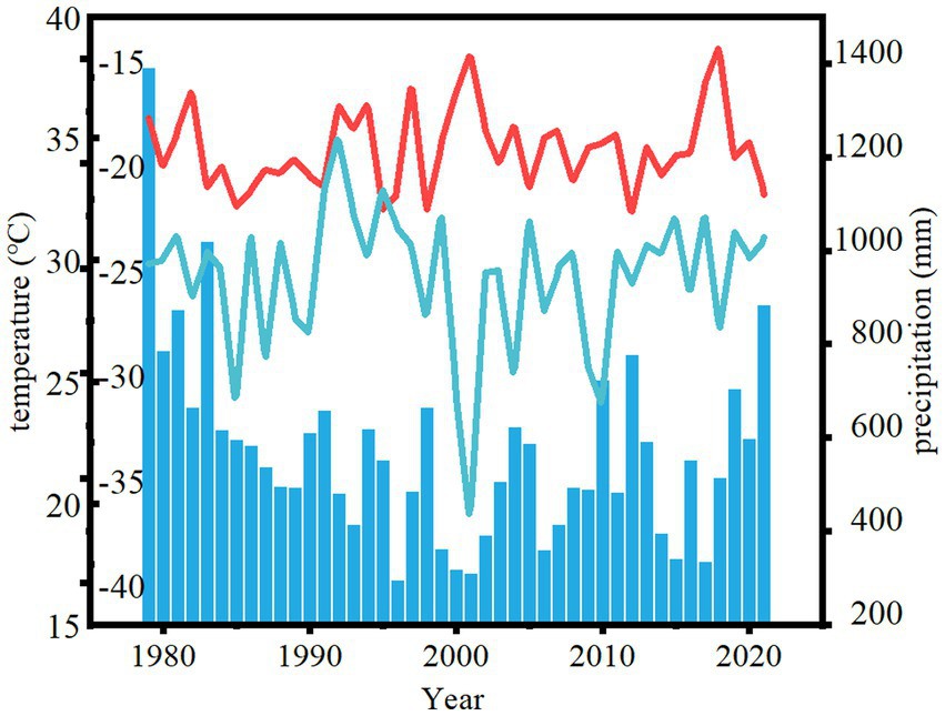 Precipitation and temperature changes in Zhangwu County from 1979 to 2021. The red line indicates the highest temperature of the year, the blue line indicates the lowest temperature of the year, and the bar chart indicates the total annual precipitation.