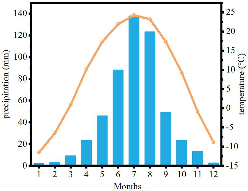 The study area is located in Zhangwu County, Liaoning Province, in the southeastern edge of Khorchin Sandy Land, which is a typical semi-arid area. The geographical location is between 121° 53 ‘and 122° 58 ‘east longitude, 42° 07 ‘and 42° 51 ‘north latitude, with an average altitude of 255 m. The main feature of the landform is that the dunes overlap each other, and there are wind erosion lowlands between the hills. It belongs to the temperate continental monsoon climate, and the main climate characteristics are drought and wind. The representative plants are Pinus sylvestris, Pinus tabuliformis, Ulmus pumila, etc. The meteorological data of the last decades show that the extreme lowest temperature is −36.3°C, the extreme highest temperature is 38.4°C, and the average annual temperature is 7.93°C. The hottest season appears in July, with an average temperature of 24.2°C. The coldest month is January, with an average temperature of −11.5°C (Figure 1). The average annual precipitation is 570.8 mm, the maximum annual precipitation is 1,390 mm, and the minimum annual precipitation is 295.1 mm. The seasonal distribution of precipitation is uneven, and the annual precipitation is concentrated in June, July and August. There is less snow in winter, spring precipitation is low, and spring drought is common (Figure 2).